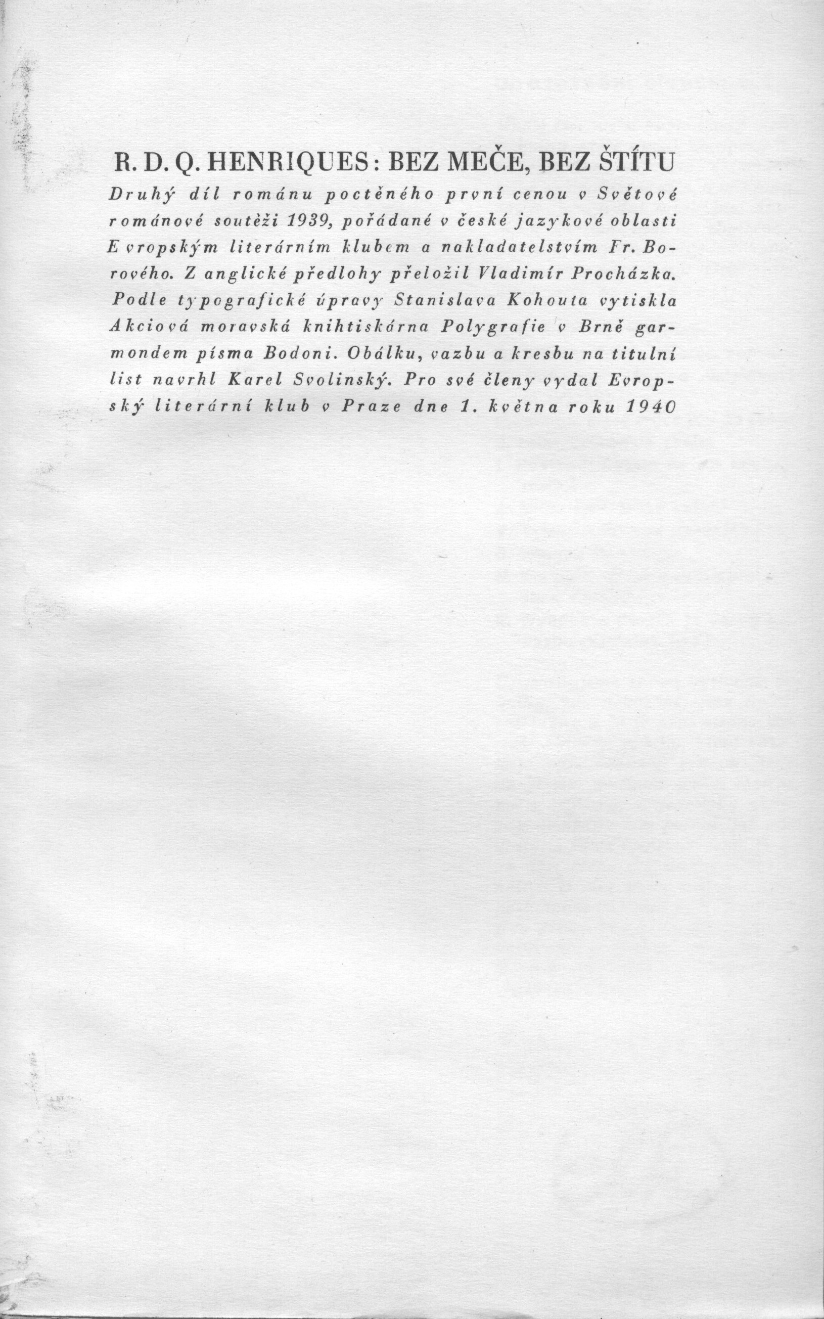 Title information Bez meče, bez štítu : [román] / Robert D. Q. Henriques ; [z anglické předlohy přeložil Vladimír Procházka ; podle typografické úpravy Stanislava Kohouta ... ; obálku, vazbu a kresbu na titulní list navrhl Karel Svolinský]. [Druhý díl] Personal name Henriques, Robert D. Q. (Robert David Quixano) 1905-1967 (Author) Další autoři Procházka, Vladimír, 1895-1968 (Translator) Kohout, Stanislav, -1965 (Typographer) Svolinský, Karel, 1896-1986 (Bookjacket designer) (Binding designer) (Illustrator) Corporation Evropský literární klub (nakladatelství) (Publisher) Akciová moravská knihtiskárna Polygrafie (Printer) Publication Praha : Evropský literární klub, 1940 Manufacture Akciová moravská knihtiskárna Polygrafie) Scope 313 s. : il. ; 23 cm ISBN brož. Country Czech Republic Language Czech Language of the original English Note Barevná obálka s ilustrací. - Na přední záložce upoutávka na knihu. - Nakladatelská značka. - Patitul. - Dvoubarevný titulní list s ilustrací. - Životopisná poznámka. - Ukazatel výslovnosti vlastních jmen. - Tiráž. - Nakladatelské upoutávka na zadní záložce a zadní straně obálky.