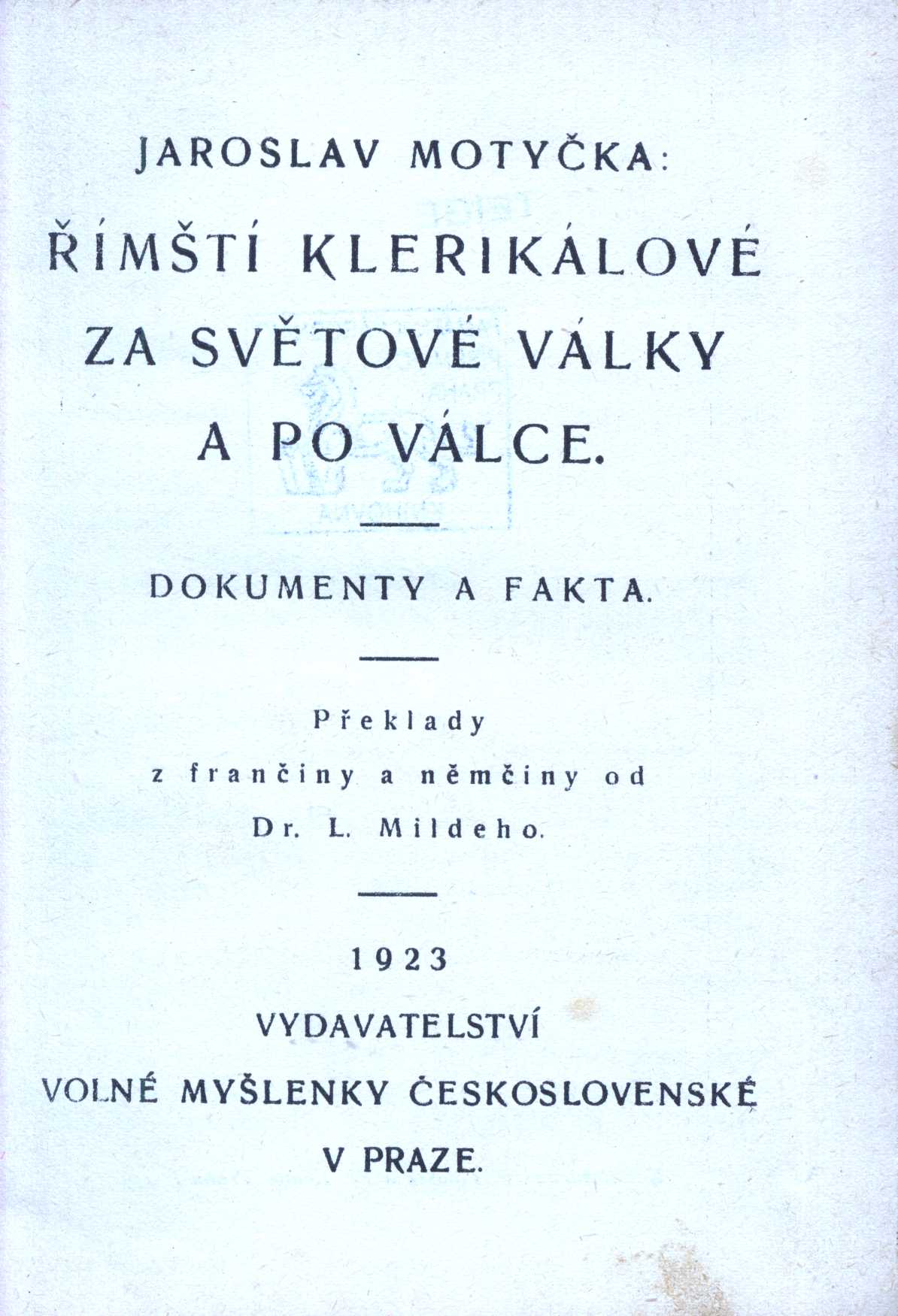 Title information Římští klerikálové za světové války a po válce : dokumenty a fakta / Jaroslav Motyčka ; překlady z frančiny a němčiny od L. Mildeho Personal name Motyčka, Jaroslav, 1886-1960 (Author) Další autoři Milde, Lubomír, 1896- (Translator) Corporation Vydavatelství Volné Myšlenky (Praha, Česko) (Publisher) Palásek a Kraus (firma) (Printer) Publication V Praze : Vydavatelství Volné myšlenky československé, 1923 Manufacture V. Palásek a Fr. Kraus) Scope 208 s., [16] s. obr. příl. ISBN (váz.) Country Czech Republic Language Czech Language of the original French * German Note Předmluva. - Doslov. - Fotografická černobílá příloha.