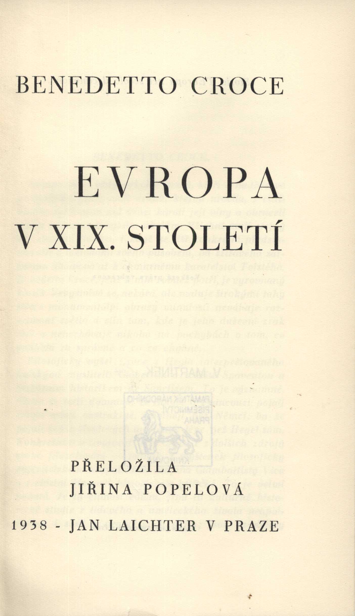 Title information Evropa v XIX. století / Benedetto Croce ; přeložila Jiřina Popelová Personal name Croce, Benedetto, 1866-1952 (Author) Další autoři Popelová, Jiřina, 1904-1985 (Translator) Corporation Jan Laichter (nakladatelství) (Publisher) Jan Aubrecht (tiskárna) (Printer) Další var.názvy Evropa v 19. století Publication V Praze : Jan Laichter, 1938 Manufacture (Tiskem Jana Aubrechta) Scope xiii, 349 s. ISBN (váz.) Edition Laichterova filosofická knihovna sv. 21
