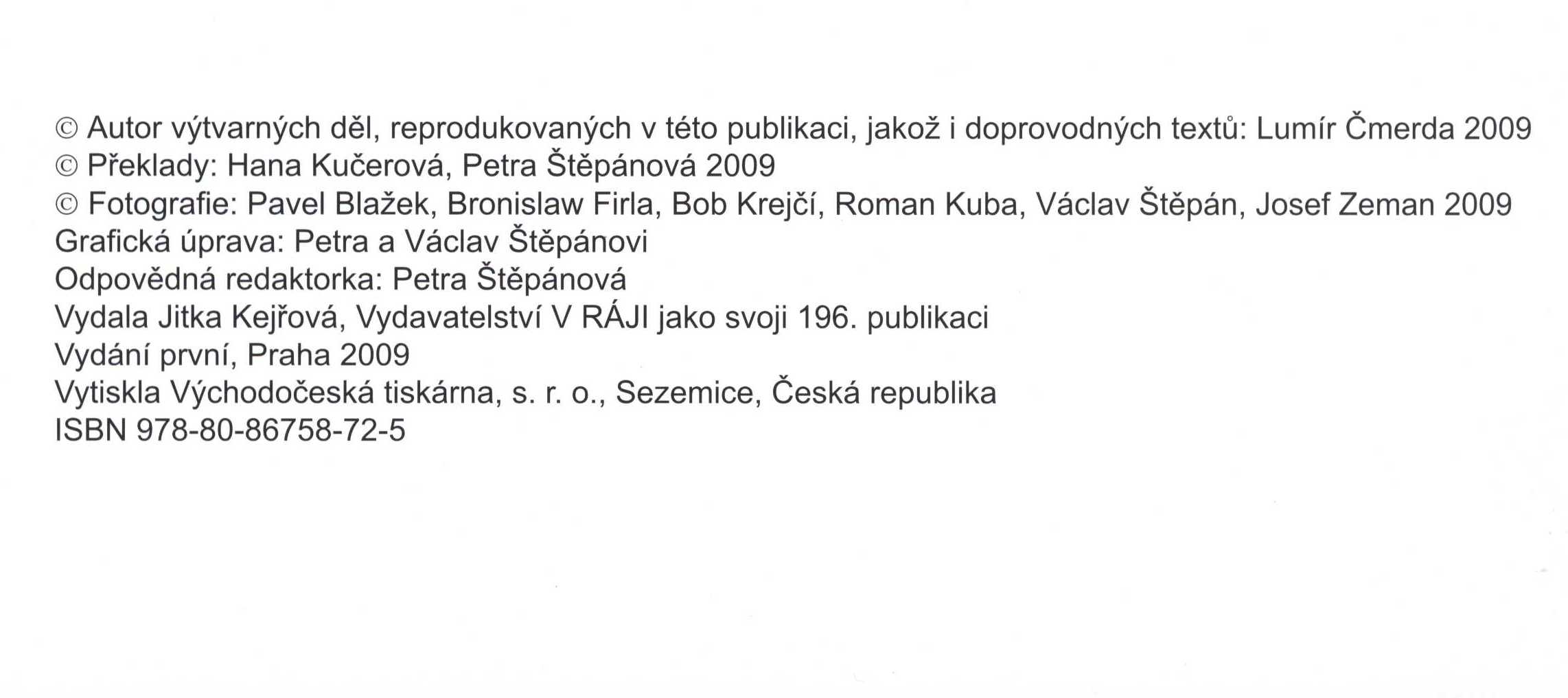 AnnotationObrazová publikace v česko-anglické verzi shrnuje tvorbu Lumíra Čmerdy, faráře Církve československé husitské a originálního výtvarníka. Představeny jsou jeho obrazy, grafiky, dřevěné refiéfy, knižní ilustrace.
