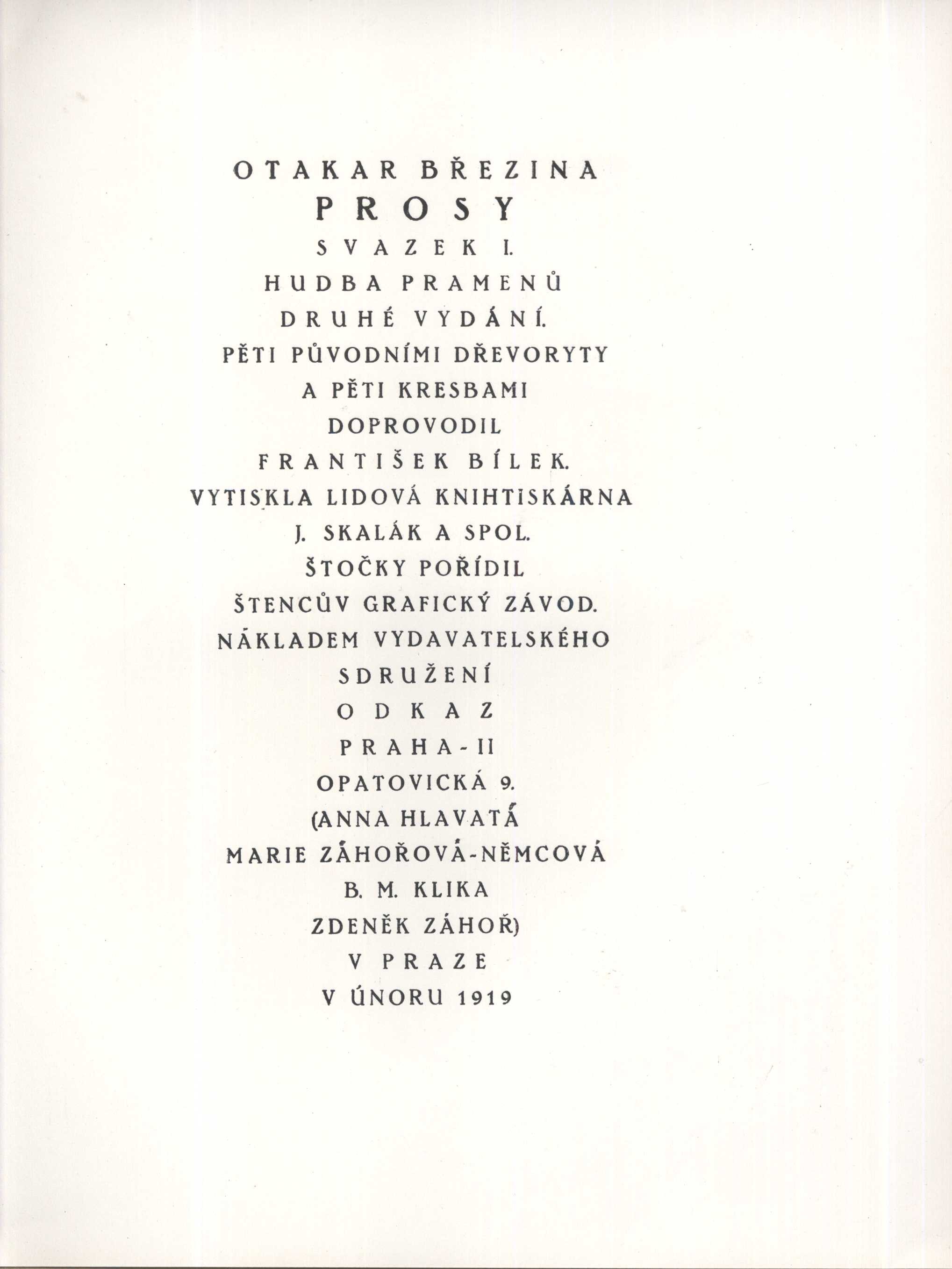 Prosy, Otakar Březina (Vydavatelské sdružení Odkaz)Country Czech Republic Language Czech Note Zdobená obálka. - Frontispis s podobiznou autora. - Reprodukce pěti dřevorytů a pěti kreseb Františka Bílka v obrazových přílohách.