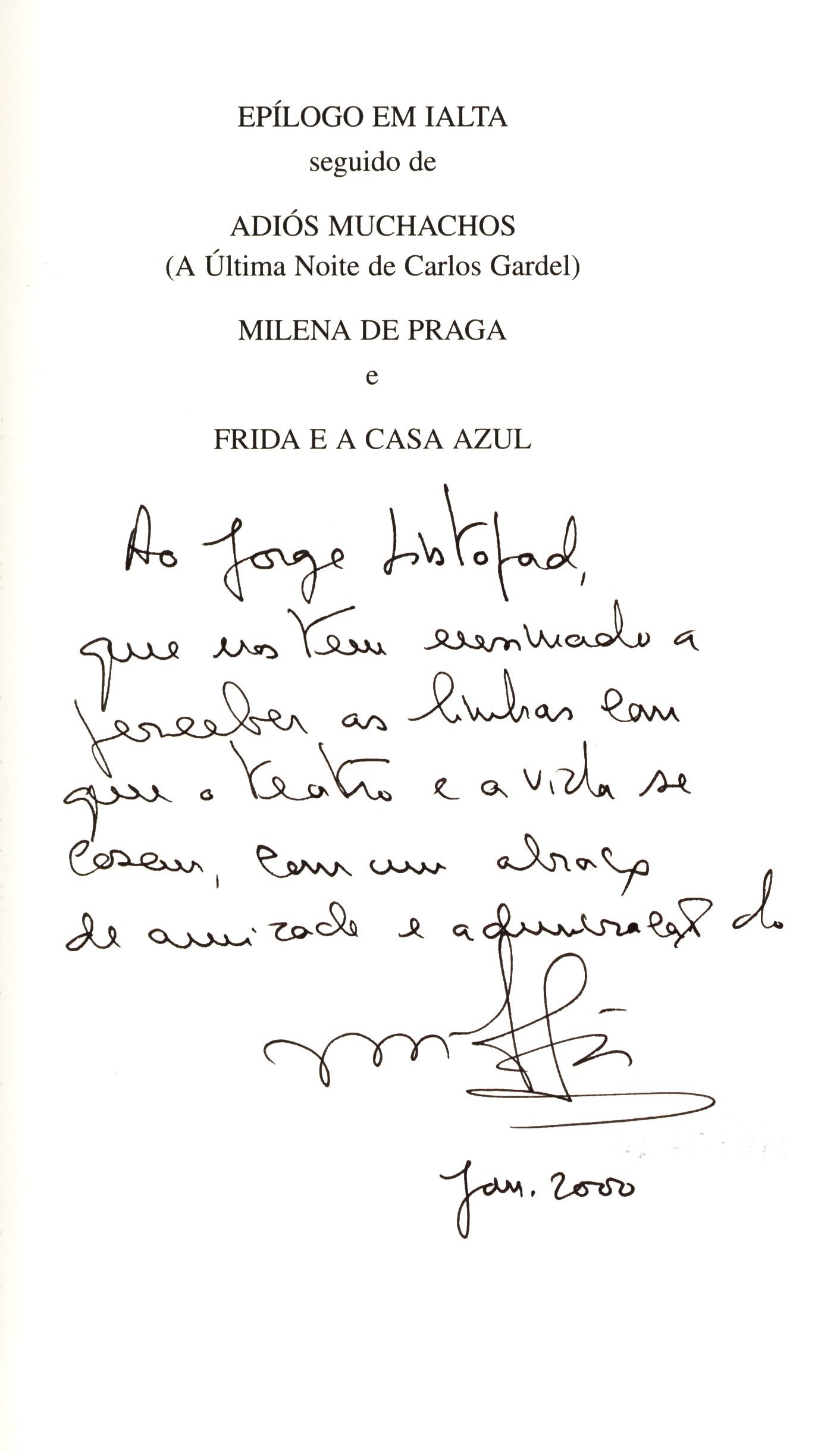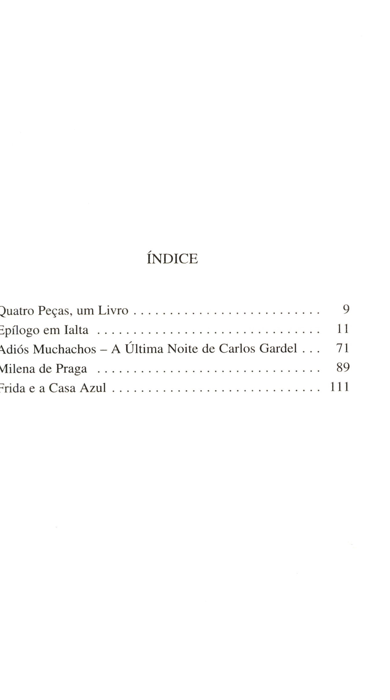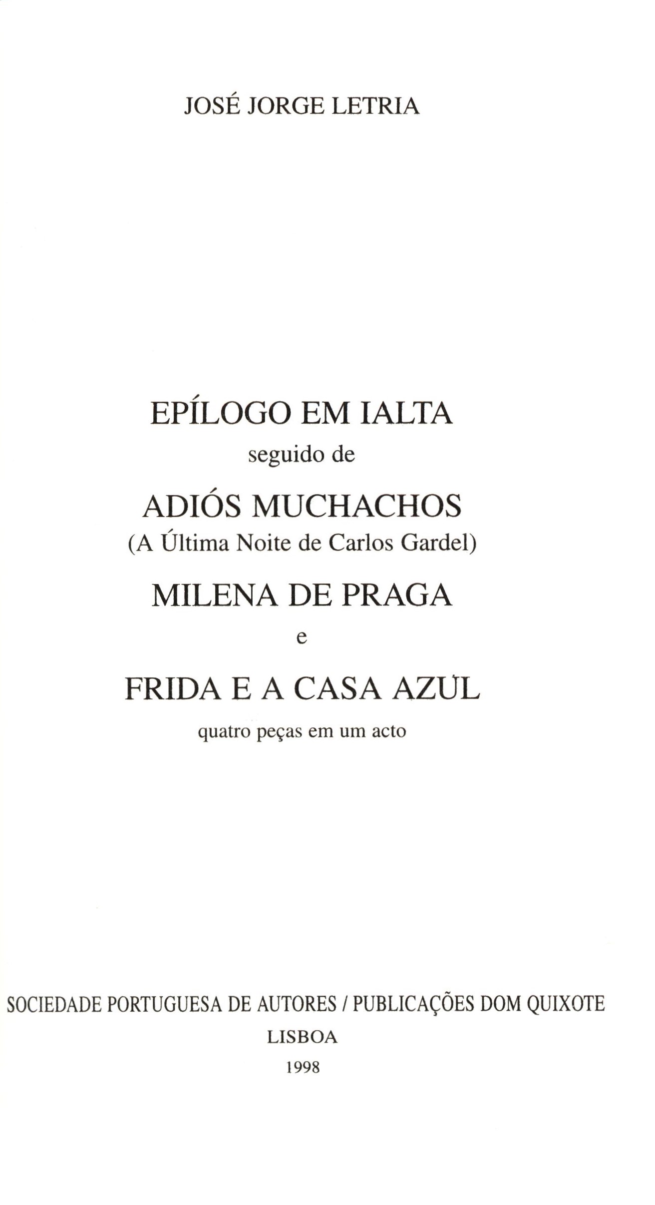 Title information Epílogo em Ialta : seguido de Adiós muchachos (a última noite de Carlos Gardel), Milena de Praga e Frida e a casa azul ; quatro peças em um acto / José Jorge Letria Personal name Letria, José Jorge, 1951- (Author) Další autoři Listopad, František, 1921-2017 (Dedicatee) Corporation Publicações Dom Quixote (Publisher) Gráfica Manuel Barbosa e Filhos (firma) (Printer) Edition statement 1. ediçao Publication Lisboa : Publicações Dom Quixote, 1998 Manufacture Gráfica Manuel Barbosa & Filhos Scope 140 stran ; 21 cm ISBN 972-20-1488-9 (brožováno) Edition Colecção de teatro da Sociedade Portuguesa de Autores ; 3. série ; 20