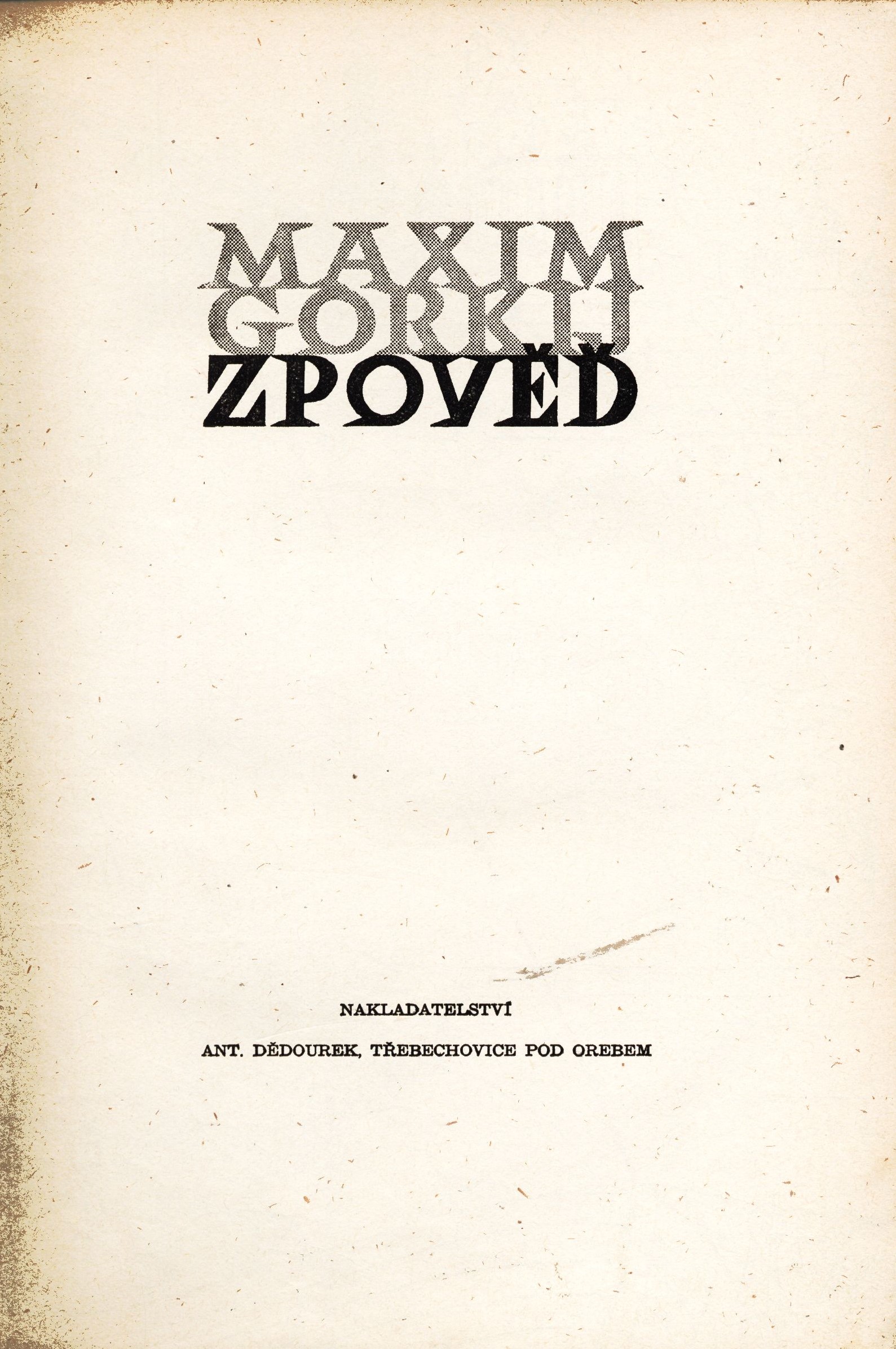 Title information Zpověď / Maxim Gorkij ; Přeložil Sergej Machonin ; Doslov napsal Karel Krejčí ; Kresby Aleny Herbenové ; Obálka Oldřicha Hlavsy Personal name Gor‘kij, Maksim, 1868-1936 (Author) Další autoři Machonin, Sergej, 1918-1995 (Translator) Krejčí, Karel, 1904-1979 (Author of afterword, colophon, etc.) Herbenová, Alena (Illustrator) Hlavsa, Oldřich, 1909-1995 (Bookjacket designer) Corporation Nakladatelství Ant. Dědourek (Publisher) Grafické závody Pour a spol. (Praha, Plzeň) (Printer) Edition statement 1. vydání Publication Třebechovice pod Orebem : Ant. Dědourek, 1946 V Praze : Grafické závody Pour a spol. Scope 244 stran : ilustrace ; 21 cm ISBN (brožováno) Edition Věnec, knihy Mistrů (Ant. Dědourek)