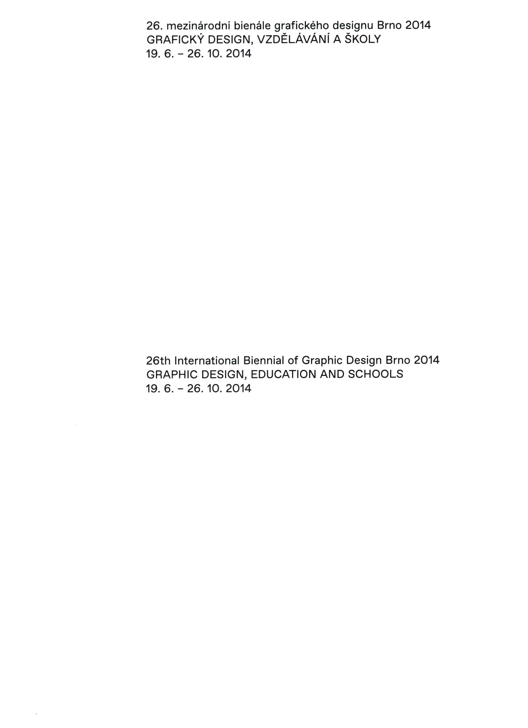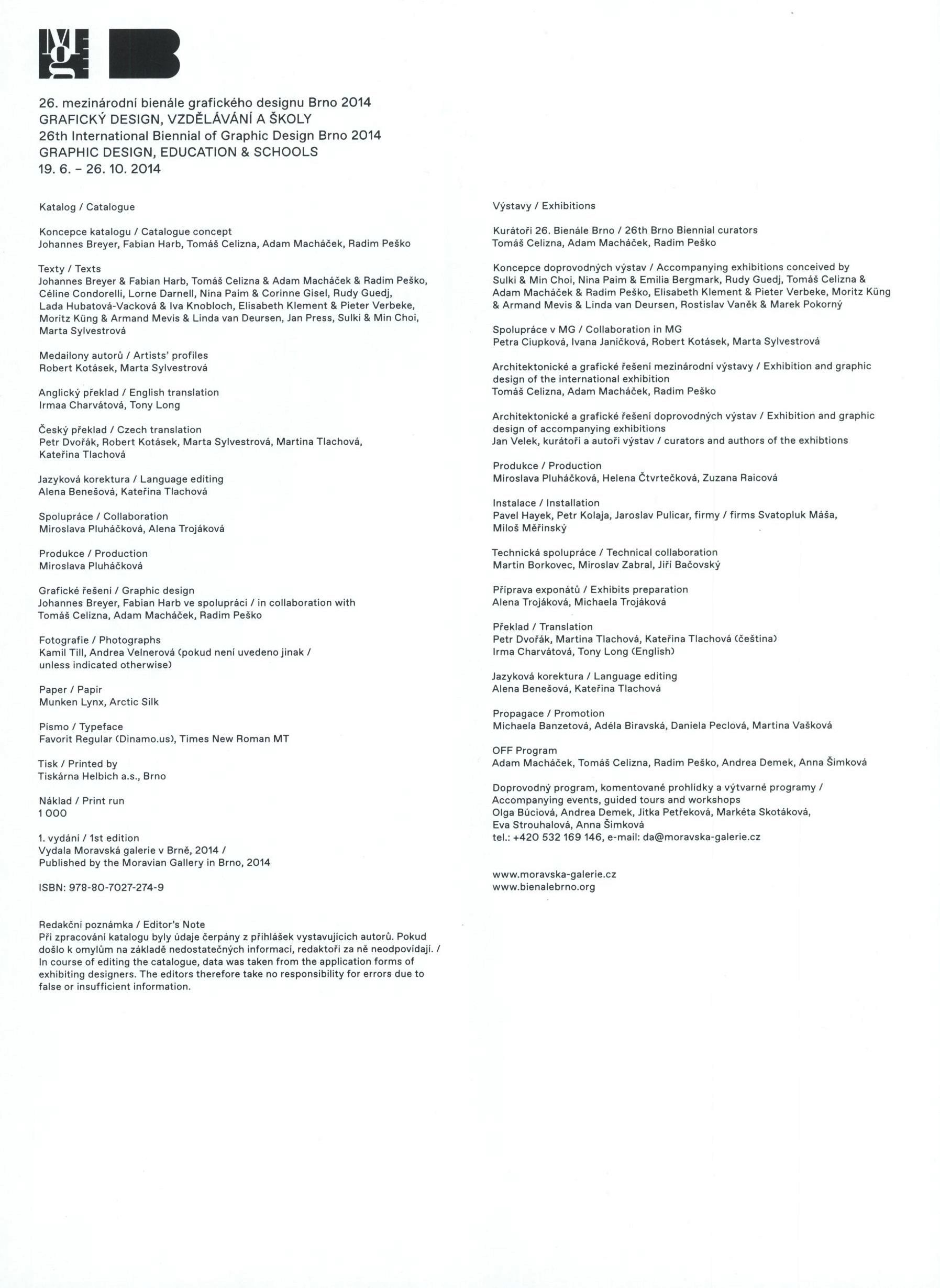 Title information Mezinárodní bienále grafického designu Brno 2014 : grafický design, vzdělávání a školy 16.6.-26.10.2014 = 26th International Biennial of Graphic Design Brno 2014 : graphic design, education and schools 16.6.-26.10. 2014 / koncepce katalogu Johannes Breyer, Fabian Harb, Tomáš Celizna, Adam Macháček, Radim Peško ; medailony autorů Robert Kotásek, Marta Sylvestrová ; anglický překlad Irma Charvátová, Tony Long ; český překlad Petr Dvořák, Robert Kotásek, Marta Sylvestrová, Martina Tlachová, Kateřina Tlachová ; grafické řešení Johannes Breyer, Fabian Harb ve spolupráci Tomáš Celizna, Adam Macháček, Radim Peško ; fotografie Kamil Till, Andrea Velnerová Personal name Breyer, Johannes, 1987- (Conceptor) (Author) (Other) Další autoři Harb, Fabian, 1988- (Conceptor) (Author) (Other) Celizna, Tomáš, 1977- (Conceptor) (Author) (Other) Macháček, Adam, 1980- (Conceptor) (Author) (Other) Peško, Radim, 1976- (Conceptor) (Author) (Other) Kotásek, Robert (Commentator) (Translator) Sylvestrová, Marta, 1955- (Commentator) (Translator) (Author) Charvátová, Irma, 1944- (Translator) Long, Tony (Translator) Dvořák, Petr, 1970- (Translator) Tlachová, Kateřina, 1960- (Translator) Dvořáková, Martina, 1985- (Translator) Till, Kamil, 1960- (Photographer) Bratrů Velnerová, Andrea, 1975- (Photographer) Corporation Moravská galerie (Brno, Česko) (Publisher) Tiskárna Helbich (Printer) Edition statement 1. vydání Publication Brno : Moravská galerie, 2014 Manufacture Brno : Tiskárna Hellbich a.s. Scope 245 stran : ilustrace ; 32 cm ISBN 978-80-7027-274-9 (brožováno) Country Czech Republic Language Czech * English Note Barevná obálka, černě graficky zdobená, s černým textem a s nakladatelskou značkou. - Dvojjazyčný titulní list. - Úvod J. Press. - Úvod kurátorů. - Pořadatelé a organizační výbor. - Poděkování. - Obsah. - Černobílé a barevné faksimile, fotografie, reprodukce s popisky (některé celostránkové) - Symposium (program). - Přehled účastníků s kreslenými portréty, značkami, karikaturami a s kontakty. - Zastoupené školy. - Autoři. - Loga pořadatelů, sponzorů a mediálních partnerů. - Tiráž s nakladatelskou značkou. - Text na zadní straně obálky. - Průsvitný přebal (silnější fólie).