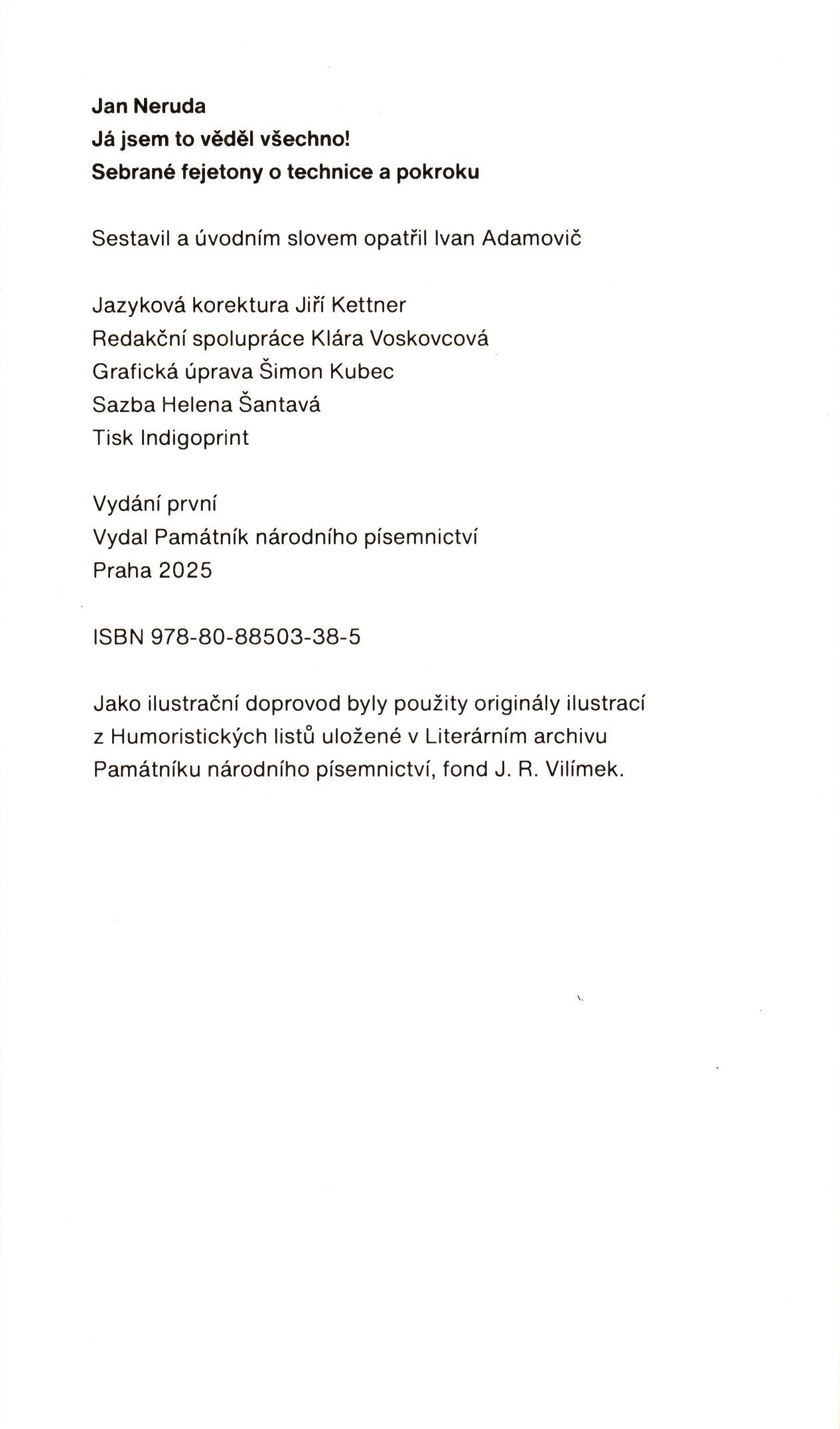Title information Já jsem to věděl všechno! : sebrané fejetony o technice a pokroku / Jan Neruda ; sestavil a úvodním slovem opatřil Ivan Adamovič ; grafická úprava Šimon Kubec Personal name Neruda, Jan, 1834-1891 (Author) Další autoři Adamovič, Ivan, 1967- (Compiler) Kubec, Šimon, 1979- Corporation Památník národního písemnictví / Muzeum literatury (Publisher) Indigoprint (tiskárna) (Printer) Edition statement Vydání první Publication Praha : Památník národnáho písemnictví, Muzeum literatury, 2025 Manufacture Indigoprint Scope 124 stran : ilustrace ; 19 cm ISBN (Brožováno) Country Czech Republic Language Czech Note Barevná obálka zdobená ilustrací. - Frontispis s podobiznou Jana Nerudy od sochaře Jana Štursy. - Úvod. - Na zadní straně obálky anotace