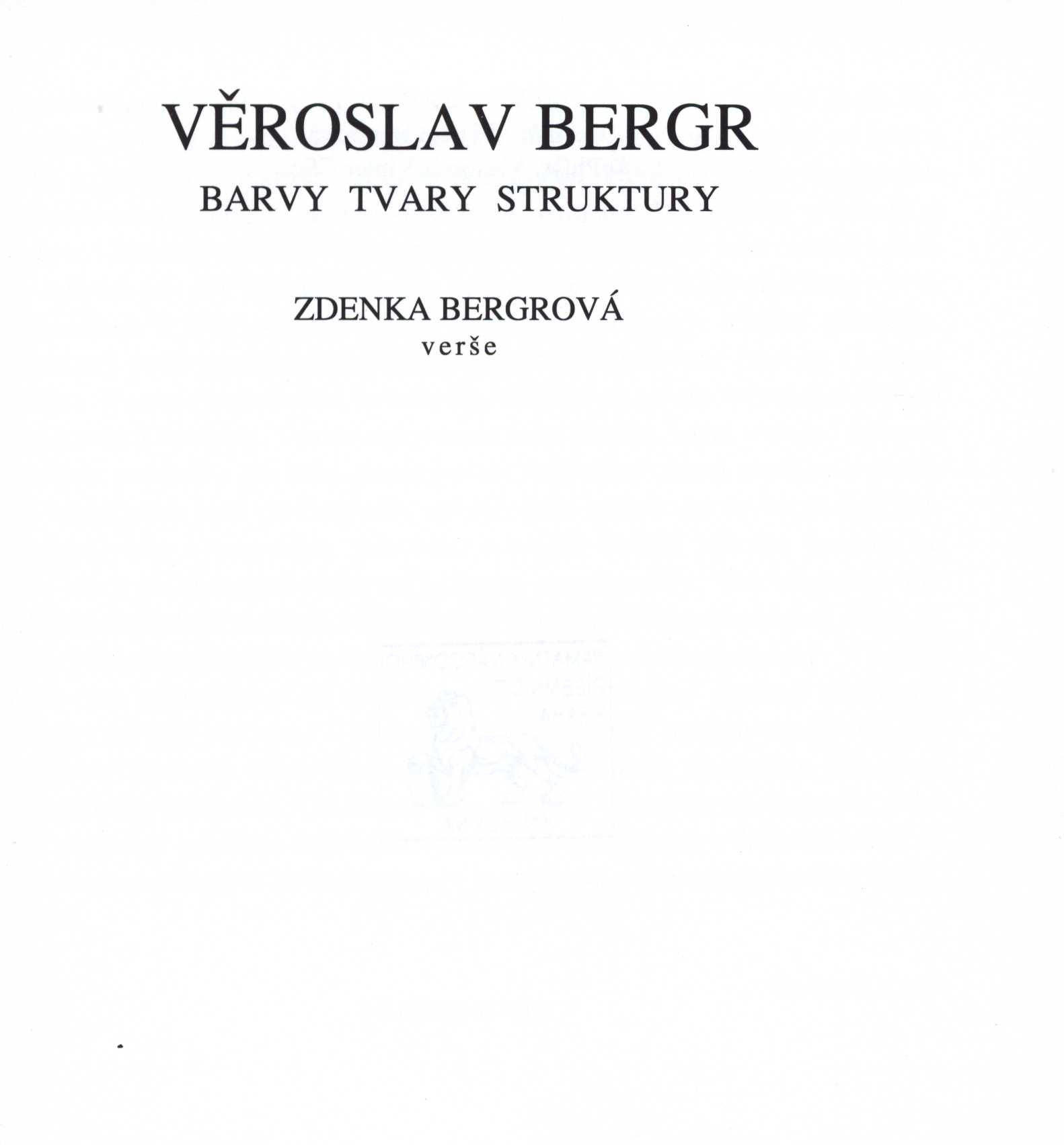 1. Title informationVěroslav Bergr : barvy, tvary, struktury / verše Zdenka Bergrová ; [uspořádala Zdenka Bergrová ; úvod napsal Vlastimil Vinter ; graficky upravil Věroslav Bergr ; reprodukovaná díla fotografovali Jiří Hampl, Zdeněk Podlesný a Michal Sadílek]