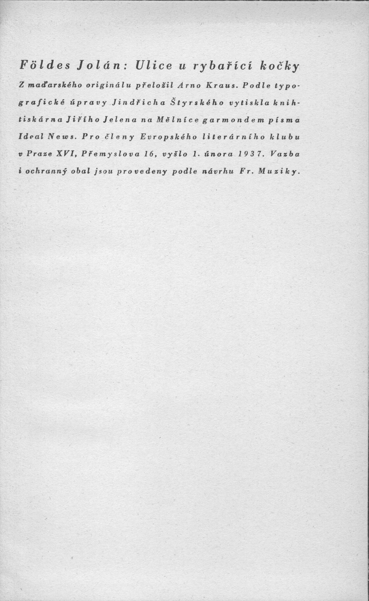 Title information Ulice u rybařící kočky / Földes Jolán ; z maďarského originálu přeložil Arno Kraus ; podle typografické úpravy Jindřicha Štyrského ... ; vazba i ochranný obal jsou provedeny podle návrhu Fr. Muziky Personal name Földes, Jolán, 1903-1963 (Author) Další autoři Kraus, Arno, 1895-1974 (Translator) (Author of afterword, colophon, etc.) Štyrský, Jindřich, 1899-1942 (Typographer) Muzika, František, 1900-1974 (Binding designer) Corporation Evropský literární klub (nakladatelství) (Publisher) Jiří Jelen (tiskárna) (Printer) Publication V Praze : Evropský literární klub, 1937 Manufacture Na Mělníku : knihtiskárna Jiřího Jelena Scope 257 stran ; 22 cm ISBN (vázáno) Country Czech Republic Language Czech Language of the original Hungarian Note Zdobená barevevná plátěná vazba s vytlačenou značkou ELK a tiskem na hřbetě. - Nakladatelská značka na vakátě. - Doslov od A. Krause. - Tiráž.
