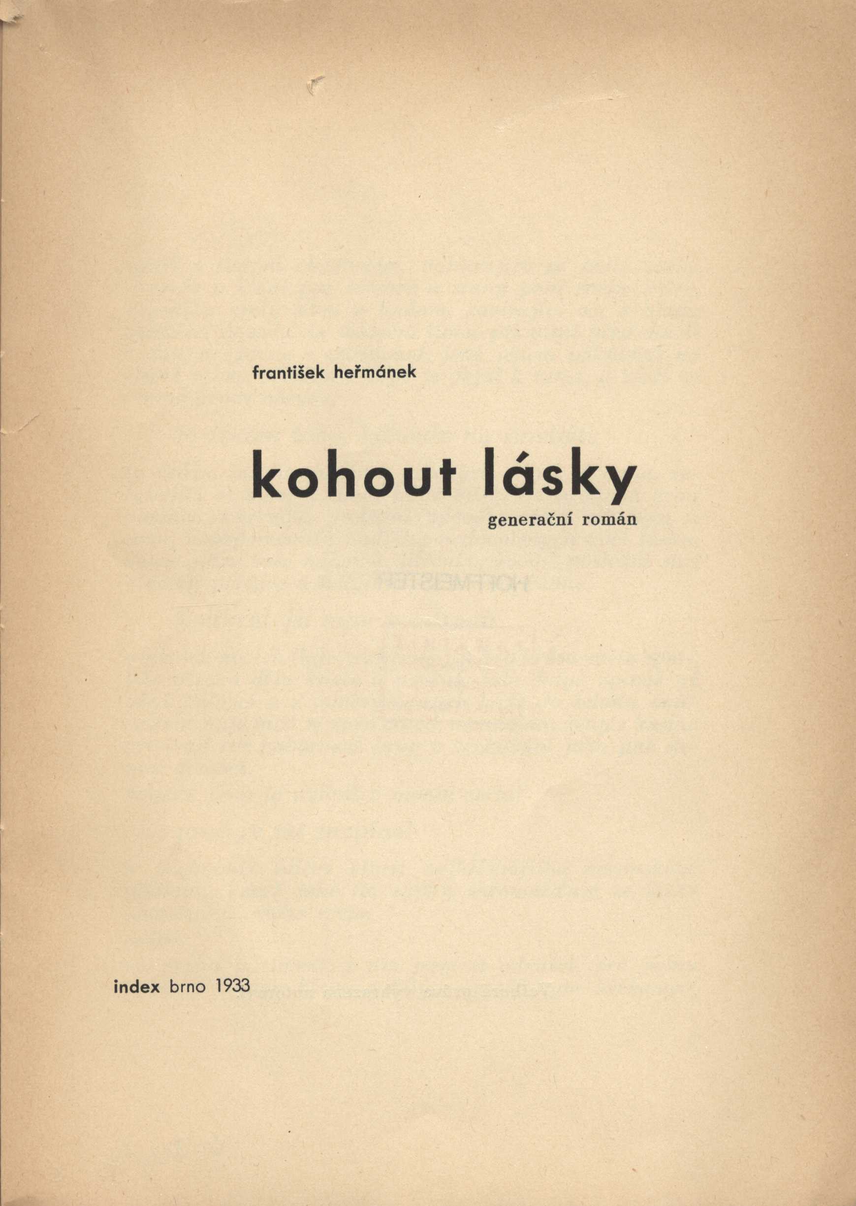 1. Title informationKohout lásky : generační román / František Heřmánek ; [obálku a titul podle návrhu Zd. Rossmanna]