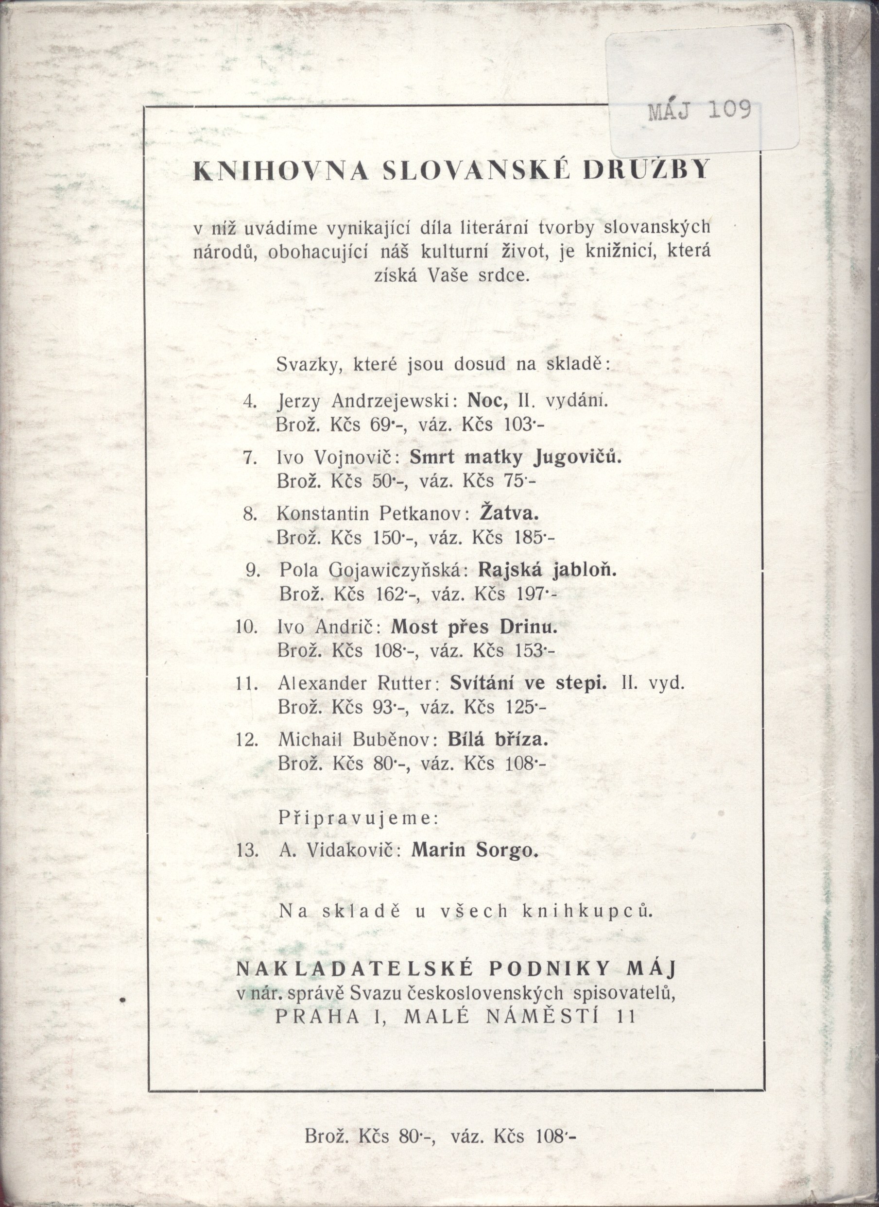 Knihovna slovanské družby, (Máj)Country Czech Republic Language Czech Language of the original Russian Note Zdobená obálka s ilustrací. - Zdobená vazba. - Na záložkách upoutávky na knihu. - Nakladatelská značka. - Patitul. - Titulní list. - Tiráž s edicí. - Na zadní straně obálky ediční upoutávky.
