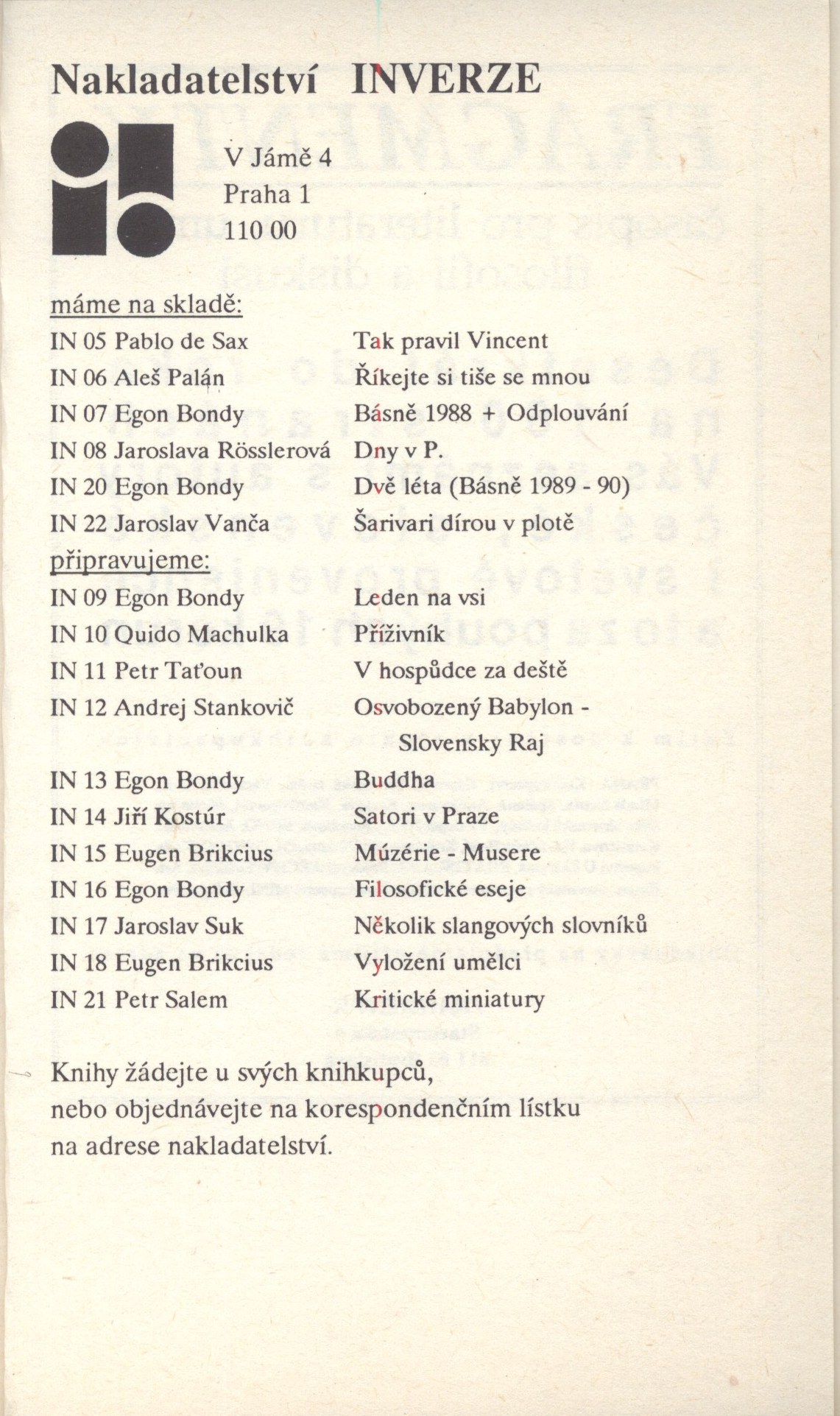 Document kind monografie Keywords česká literatura * poezie * básně * Bondy E. * r. 1989 * r. 1990 UDC 821.162.3 * 82-1 Uživatelské pole PNP U sign. Topič osobní knihovna Topiče a Milady Blekastad. U sign. Topič 0525 (brožovaný výtisk) dvoubarevná zdobená obálka (P. Reisenauer) s nakladatelskou značkou. - Nakladatelství. - Patitul. - Titulní list. - Předmluva (M. Machovec). - Tiráž. - Nakladatelské upoutávky a inzerce. - Zdobená i zadní strana obálky s fotografií autora. U sign. Topič 0525 zachovalý výtisk. Rozsah: 124, [4] s. Rozměr: 16,4 cm Sign. BVolkova 1677 - Knihovna B. Volková. Call number Track No. Location Info Topič 0525 0142/2015 Sbírka BVolkova 1677 0654/2020 Sbírka