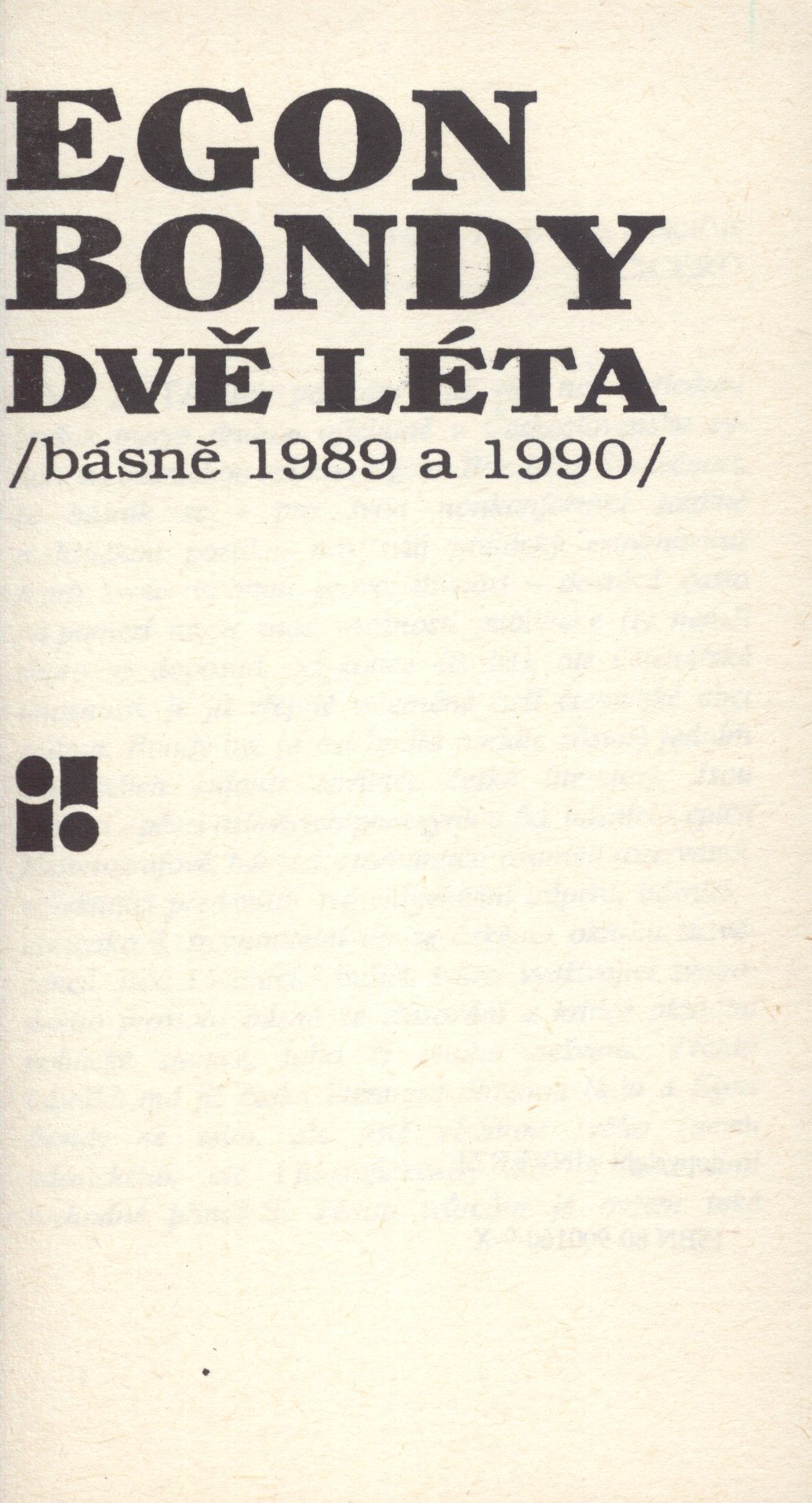 Title information Dvě léta : (básně 1989 a 1990) / Egon Bondy ; předmluvu napsal Milan Machovec ; obálku navrhl Pavel Reisenauer Personal name Bondy, Egon, 1930-2007 (Author) Další autoři Machovec, Martin, 1956- (Author of introduction) Reisenauer, Pavel, 1961-2024 (Bookjacket designer) Corporation Inverze (nakladatelství) (Publisher) Východočeské tiskárny (Havlíčkův Brod) (Printer) (Printer of plates) Další var.názvy Básně 1989 a 1990 Publication Praha : Inverze, 1991 Manufacture Havlíčkův Brod : Východočeské tiskárny, závod 04 Scope 124 stran ; 17 cm ISBN 80-900160-9-X (brožováno) Country Czech Republic Language Czech Note Zdobená obálka. - Titulní list. - Předmluva. - Tiráž. - Nakladatelské upoutávky a inzerce.