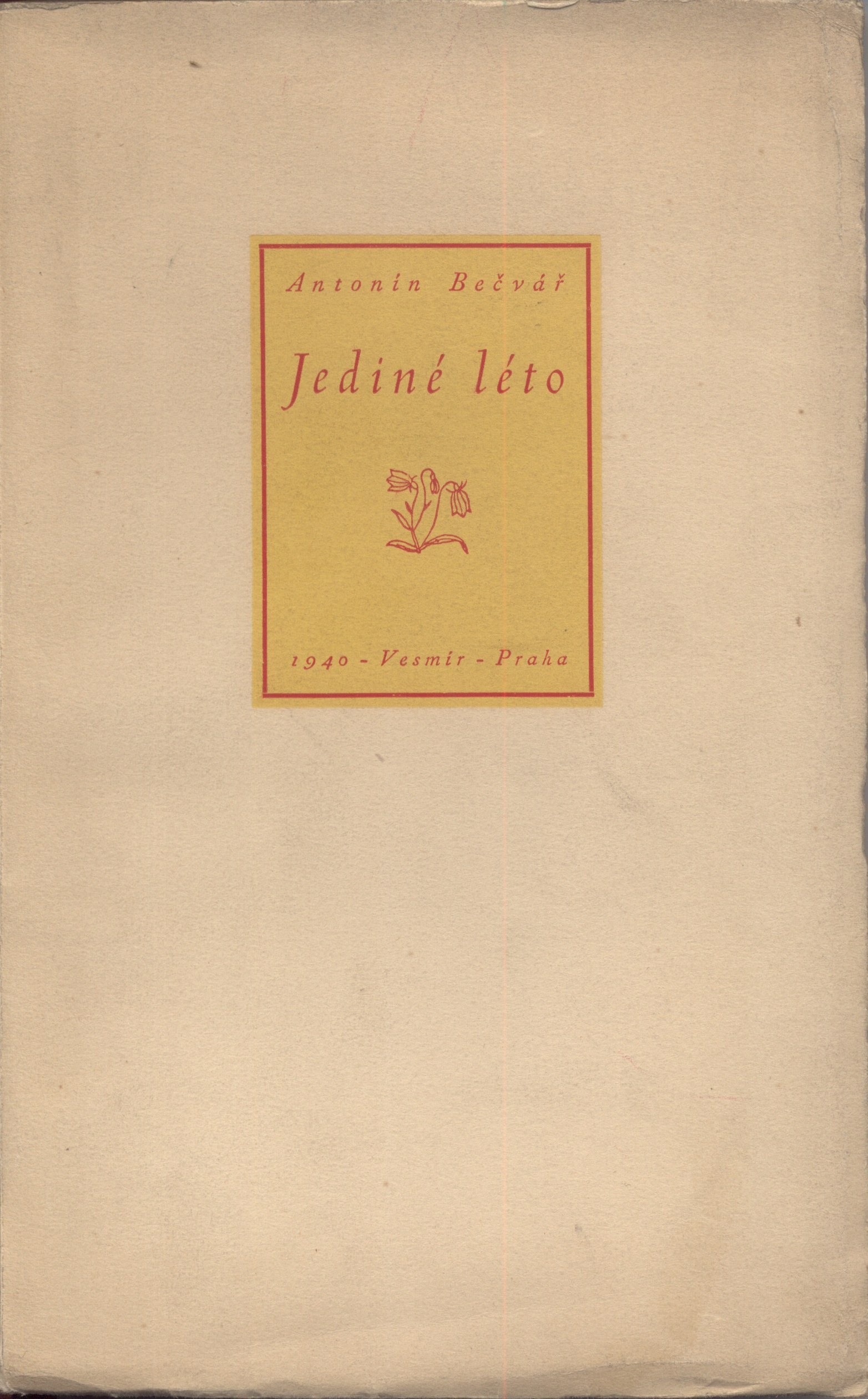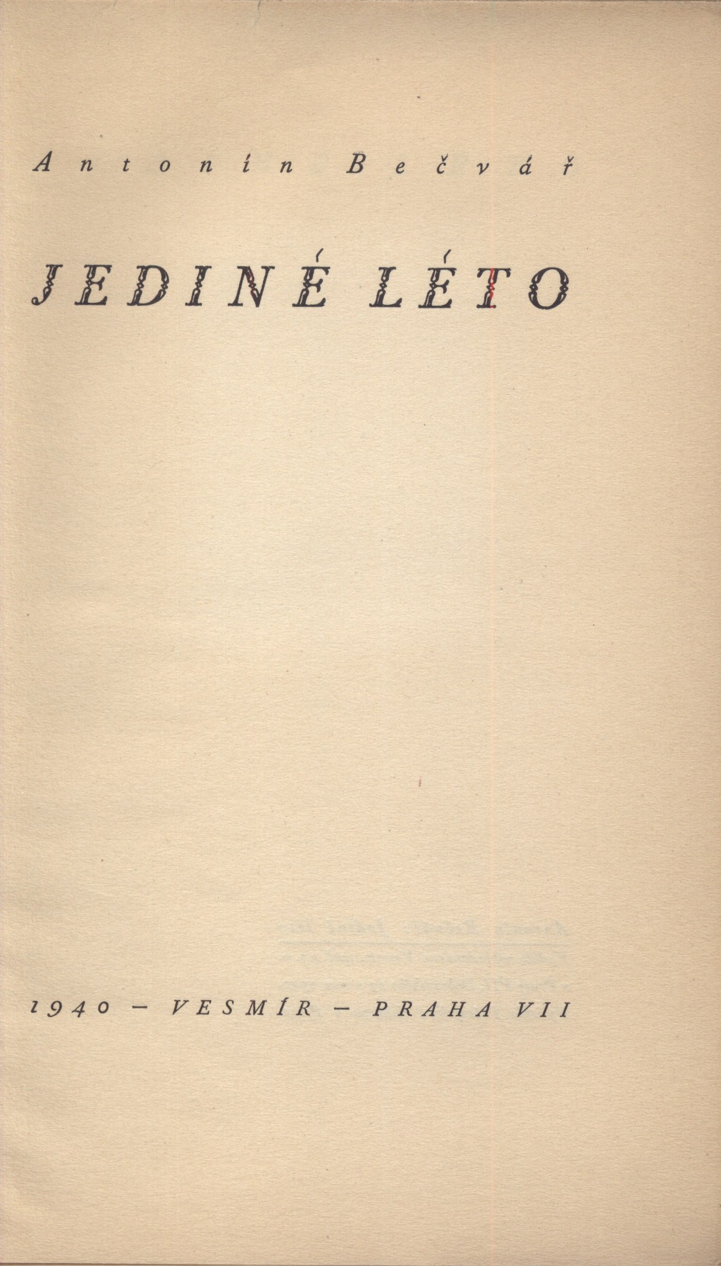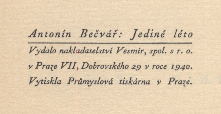 Title information Jediné léto / Antonín Bečvář Personal name Bečvář, Antonín, 1901-1965 (Author) Další autoři Vesmír (nakladatelství) (Publisher) Průmyslová tiskárna v Praze (Printer) Publication Praha : Vesmír, 1940 Manufacture Průmyslová tiskárna) Scope [4], 223 s. ; 22 cm ISBN (Brož.) Country Czech Republic Language Czech Note Zdobená obálka. - Titulní list. - Nakladatelské údaje na rubu titulního listu.