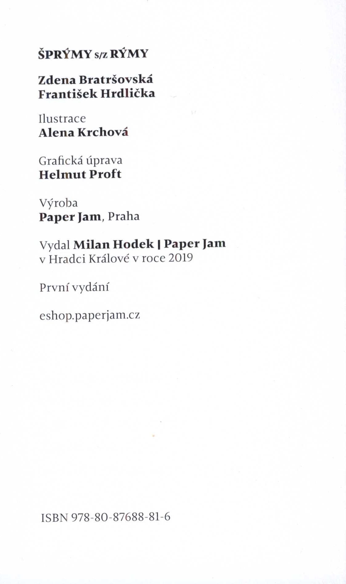 Title information Šprýmy s/z rýmy : limericky pro malé i velké / Zdena Bratršovská, František Hrdlička ; ilustrace Alena Krchová Personal name Bratršovská, Zdena, 1951- (Author) Další autoři Hrdlička, František, 1937- (Author) Krchová, Alena, 1990- (Illustrator) Corporation Milan Hodek (nakladatelství) (Publisher) Paper Jam (tiskárna) (Printer) Edition statement První vydání Publication V Hradci Králové : Milan Hodek - Paper Jam, 2019 Manufacture Praha : Paper Jam Scope 102 stran : barevné ilustrace ; 17 cm ISBN 978-80-87688-81-6 (brožováno) Country Czech Republic Language Czech Note Barevně ilustrována obálka. - Na záložkách obálky anotace a poznámka o autorech a ilustrátorce. - Barevné celostránkové ilustrace.