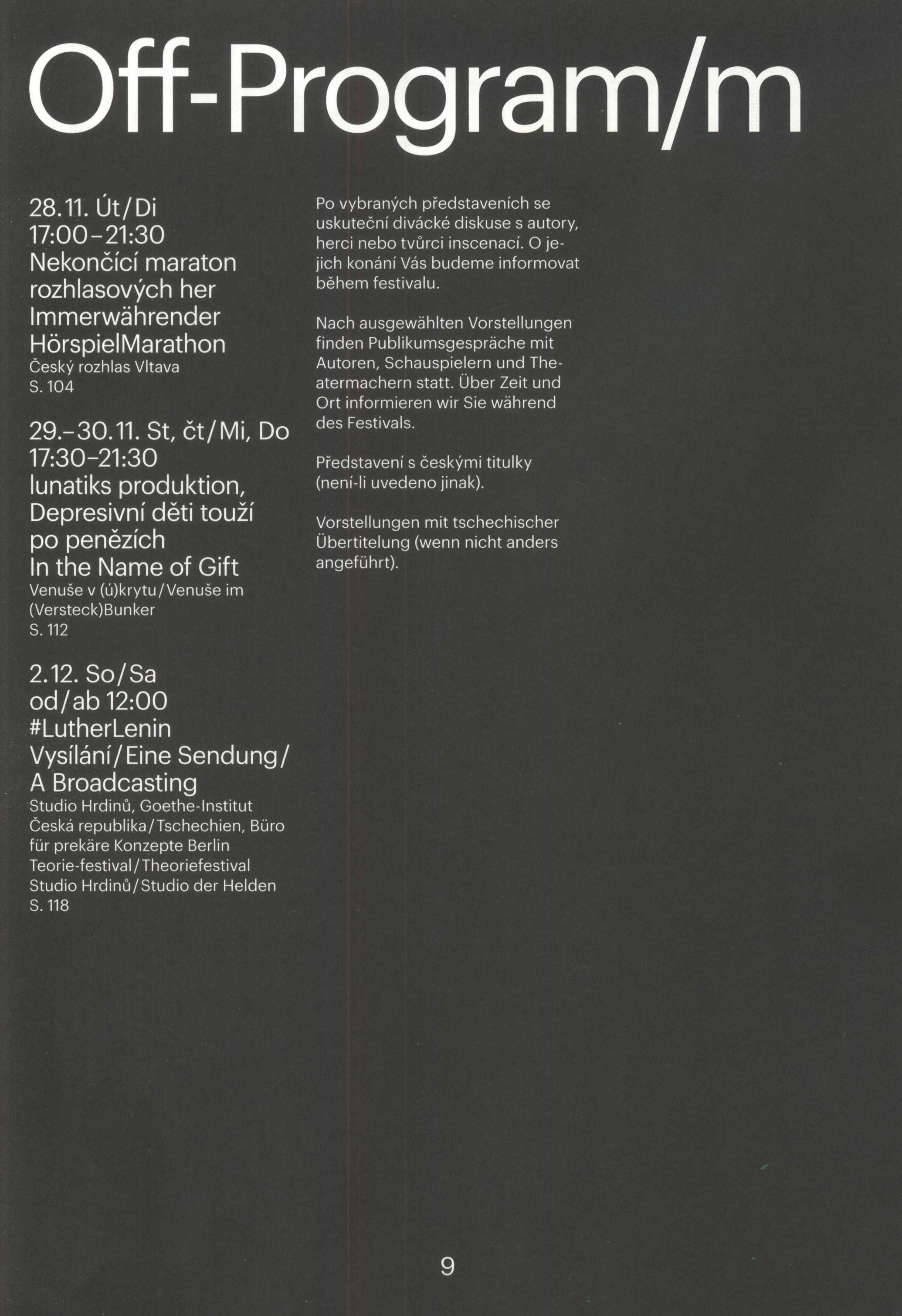 Title information 22. Pražský divadelní festival německého jazyka : 22. Prager Theaterfestival deutscher Sprache : 19.11-1.12 2017 / text Petr Štědroň ; překlad: Jitka Jílková, Silke Klein, Miriam Neudertová ; design: Mikuláš Macháček, Kateřina Baránková / zetzetzet Main entry-action Pražský divadelní festival německého jazyka (22 : 2017 : Praha, Česko) Další autoři Štědroň, Petr, 1976- (Author) Jílková, Jitka, 1954- (Translator) Klein, Silke, 1971- (Translator) Neudertová, Miriam, 1981- Macháček, Mikuláš, 1976- (Book designer) Baránková, Kateřina, 1993- (Book designer) Corporation THEATER.cz, z.s. (spolek) (Publisher) (Organizer of meeting) Indigoprint (tiskárna) (Printer) Corporation Pražský divadelní festival německého jazyka (Organizer of meeting) Další var.názvy Alles klar? Publication [Praha] : THEATER.cz, z.s., [2017] Manufacture [Praha] : Indigoprint Scope 133 stran : ilustrace Country Czech Republic Language Czech * German Language of the original Czech Note Název v tiráži: Alles klar? Programová brožura 22. ročníku Pražského divadelního festivalu německého jazyka. - Stříbrno-černá obálka s černými a stříbrnými písmeny. - Úvod A. Krnáčová, K. Larischová. - Obsah. - Jednotlivá představení, barevné fotografie. - Inzerce. - Loga sponzorů.