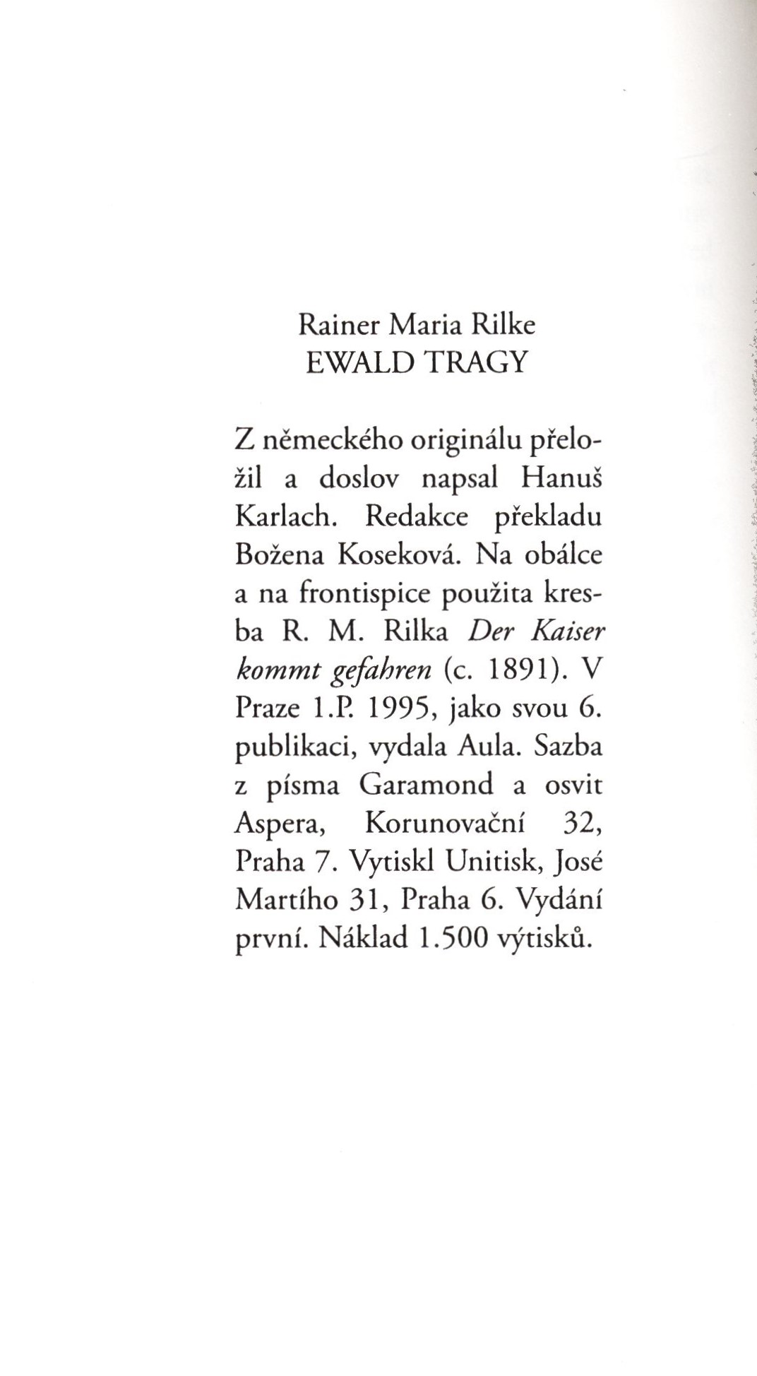 1. Title informationEwald Tragy / Rainer Maria Rilke ; Z německého originálu přeložil a doslov napsal Hanuš Karlach