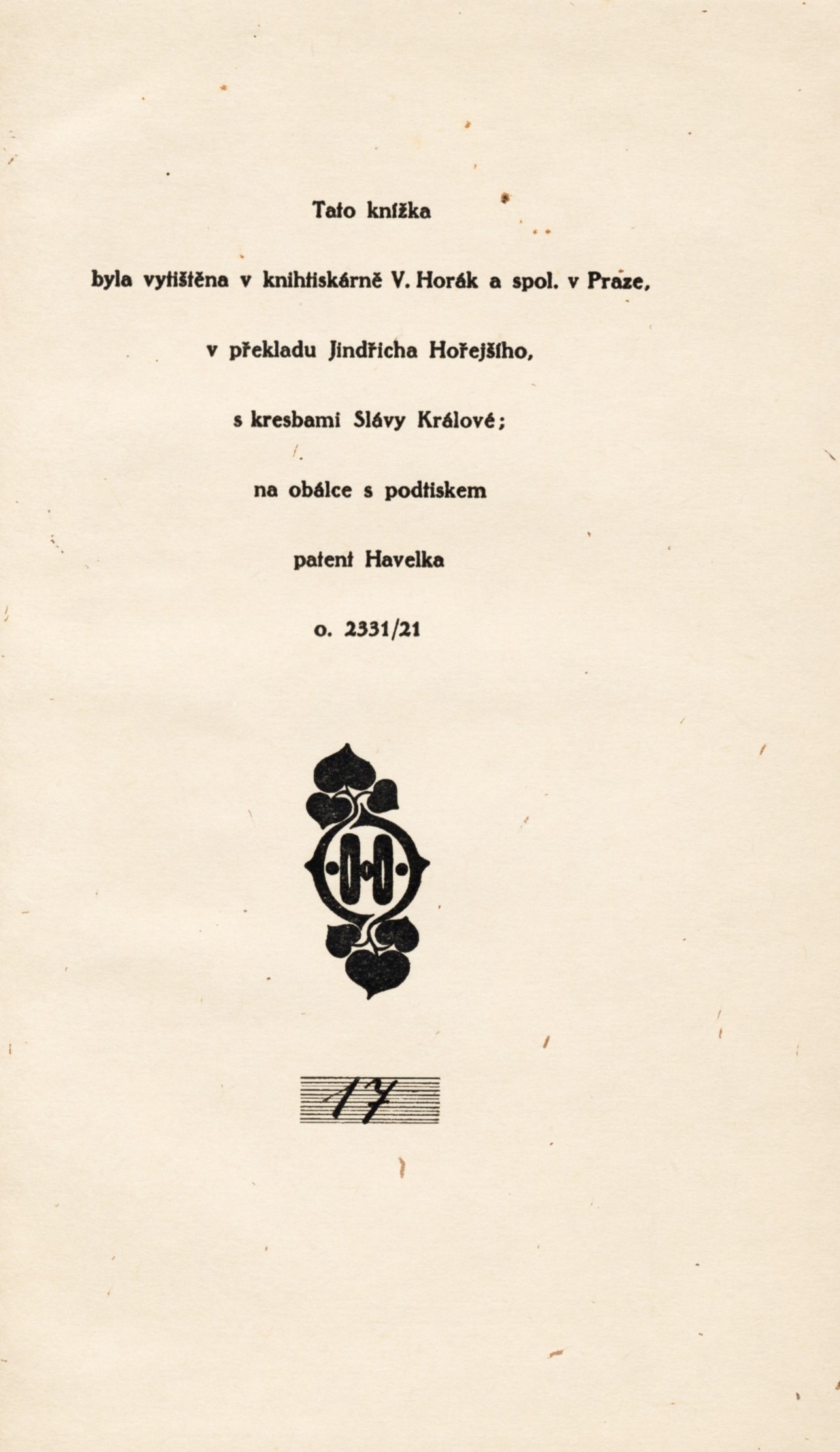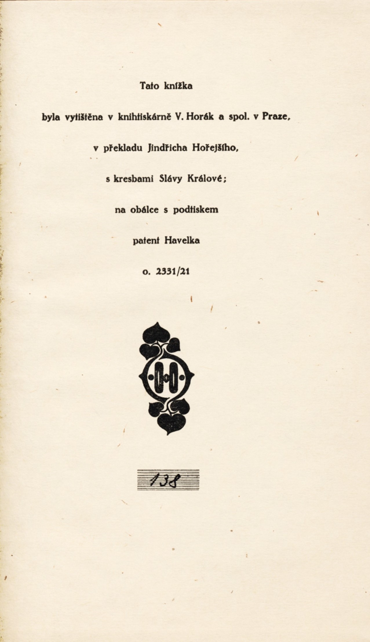 Title information Kapitán Kap / Alphonse Allais ; přeložil Jindřich Hořejší Personal name Allais, Alphonse, 1854-1905 (Author) Další autoři Hořejší, Jindřich, 1886-1941 (Translator) Králová, Sláva (Illustrator) Havelka, František Josef, 1882-1947 (Publisher) Corporation V. Horák a spol. (Praha) (Printer) Publication Praha : vydává za Kroužek umělců F. J. Havelka, 1921 Manufacture V Praze : V. Horák a spol. Scope 50 stran : ilustrace ; 20 cm ISBN (Vázáno) Edition Knihovna Naše i cizí květy ; sv. 2