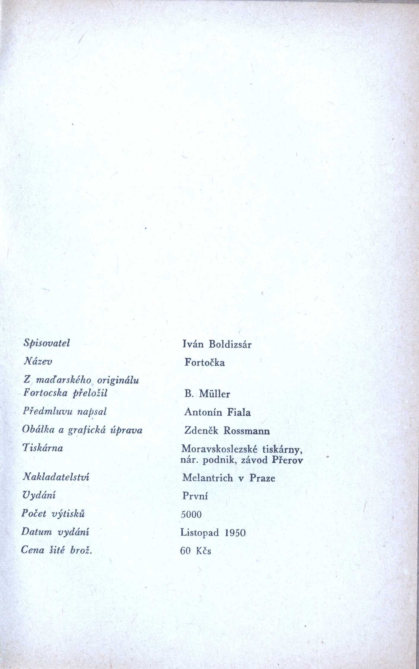 Title information Fortočka / Iván Boldizsár ; [z maďarského originálu ... přeložil B. Müller ; předmluvu napsal Antonín Fiala ; obálka a grafická úprava Zdeněk Rossmann] Personal name Boldizsár, Iván, 1912-1988 (Author) Další autoři Greža, Jan, 1897-1960 (Translator) Fiala, Antonín, 1902-1972 (Author of introduction) Rossmann, Zdeněk, 1905-1984 (Bookjacket designer) (Book designer) Corporation Melantrich (nakladatelství) (Publisher) Edition statement vyd. 1. Publication Praha : Melantrich, 1950 Manufacture Moravskoslez. tisk., n.p., záv) Scope 249 s. ; 8° ISBN brož. Country Czech Republic Language Czech Language of the original Hungarian Note Zdobená obálka. - Předmluva.