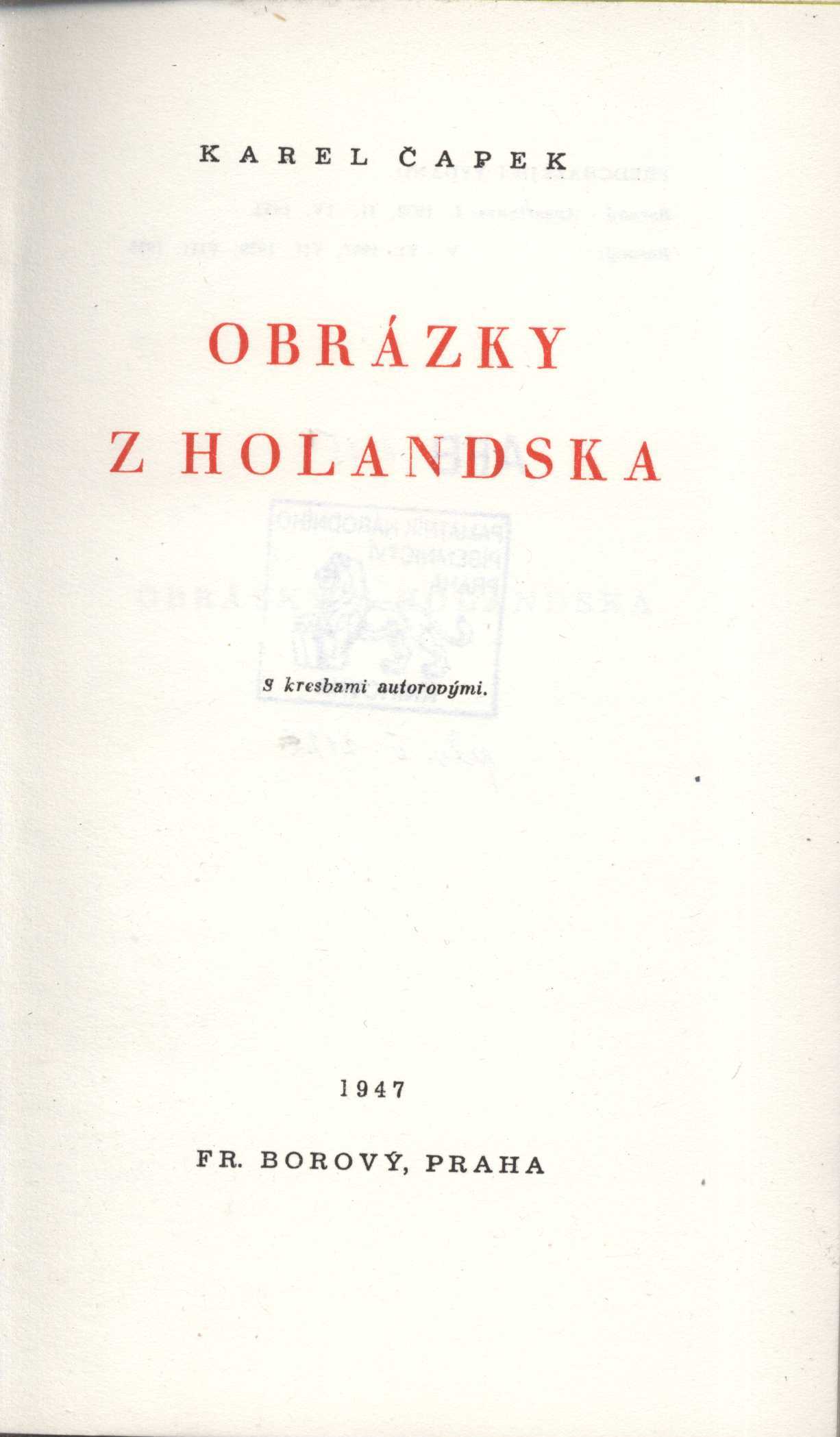 Title information Obrázky z Holandska / Karel Čapek ; s kresbami autorovými ; [v obálce Fr. Muziky] Personal name Čapek, Karel, 1890-1938 (Author) (Illustrator) Další autoři Muzika, František, 1900-1974 (Bookjacket designer) Corporation Fr. Borový (firma) (Publisher) Grafické závody V. a A. Janata (Printer) Edition statement 9. vyd. Publication Praha : Fr. Borový, 1947 Manufacture Grafické závody V. & A. Janata) Scope 86 s. : il. ; 8° ISBN (váz.) Edition Spisy bratří Čapků sv. 30