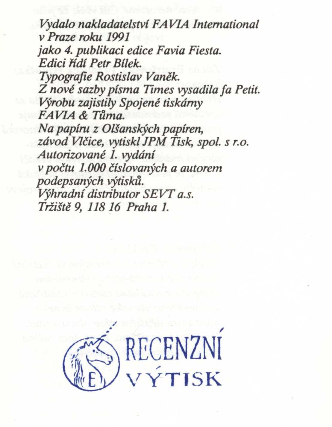 Note Zdob. vazba a předsádky. -- Průhledný přebal. -- Poznámka o autorovi. -- 1000 číslovaných a autorem podepsaných výtisků. -- Recenzní výtisk.