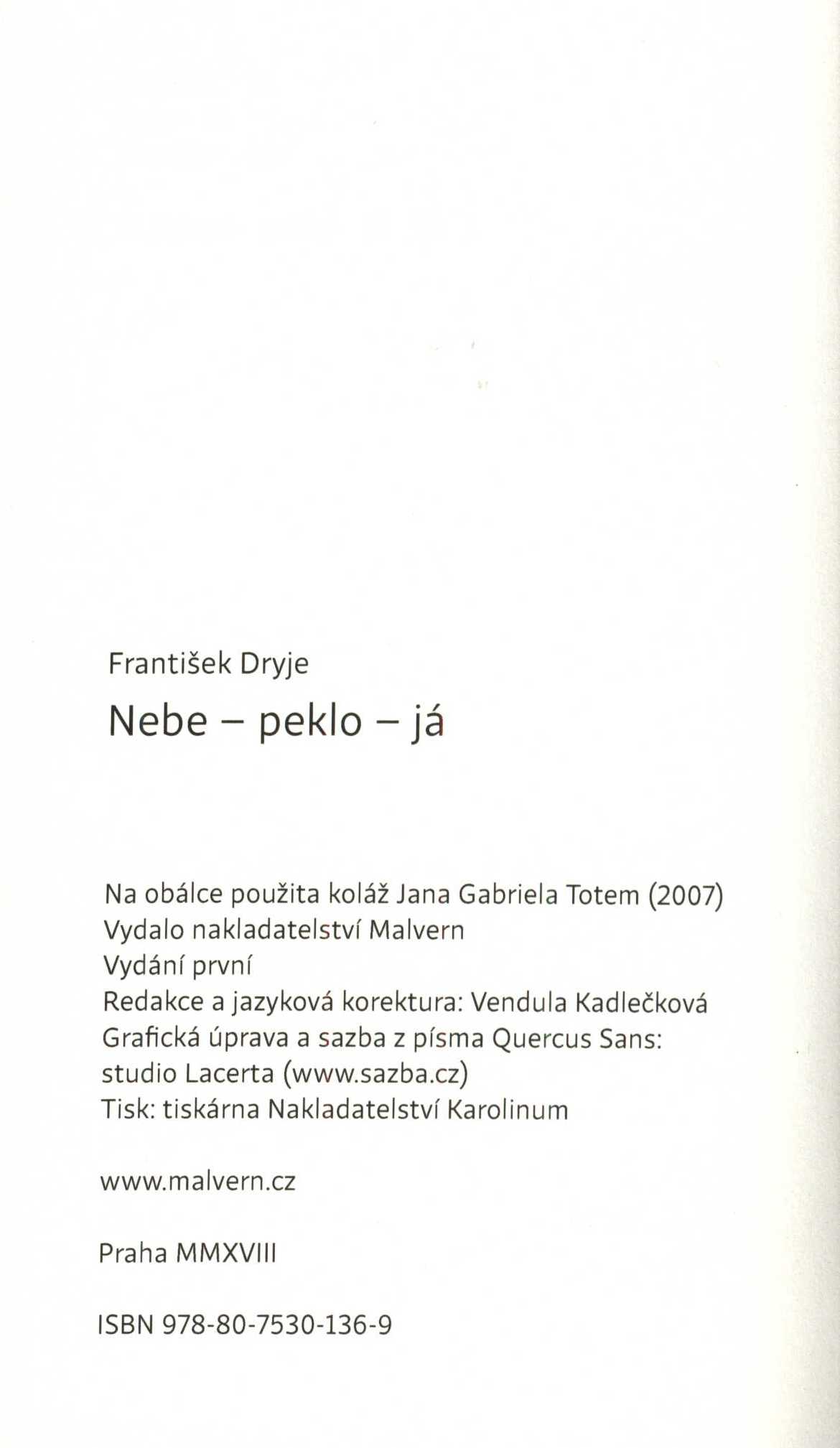 1. Title informationNebe - peklo - já : 2016-2017 / František Dryje ; na obálce použita koláž Jana Gabriela Totem (2007)