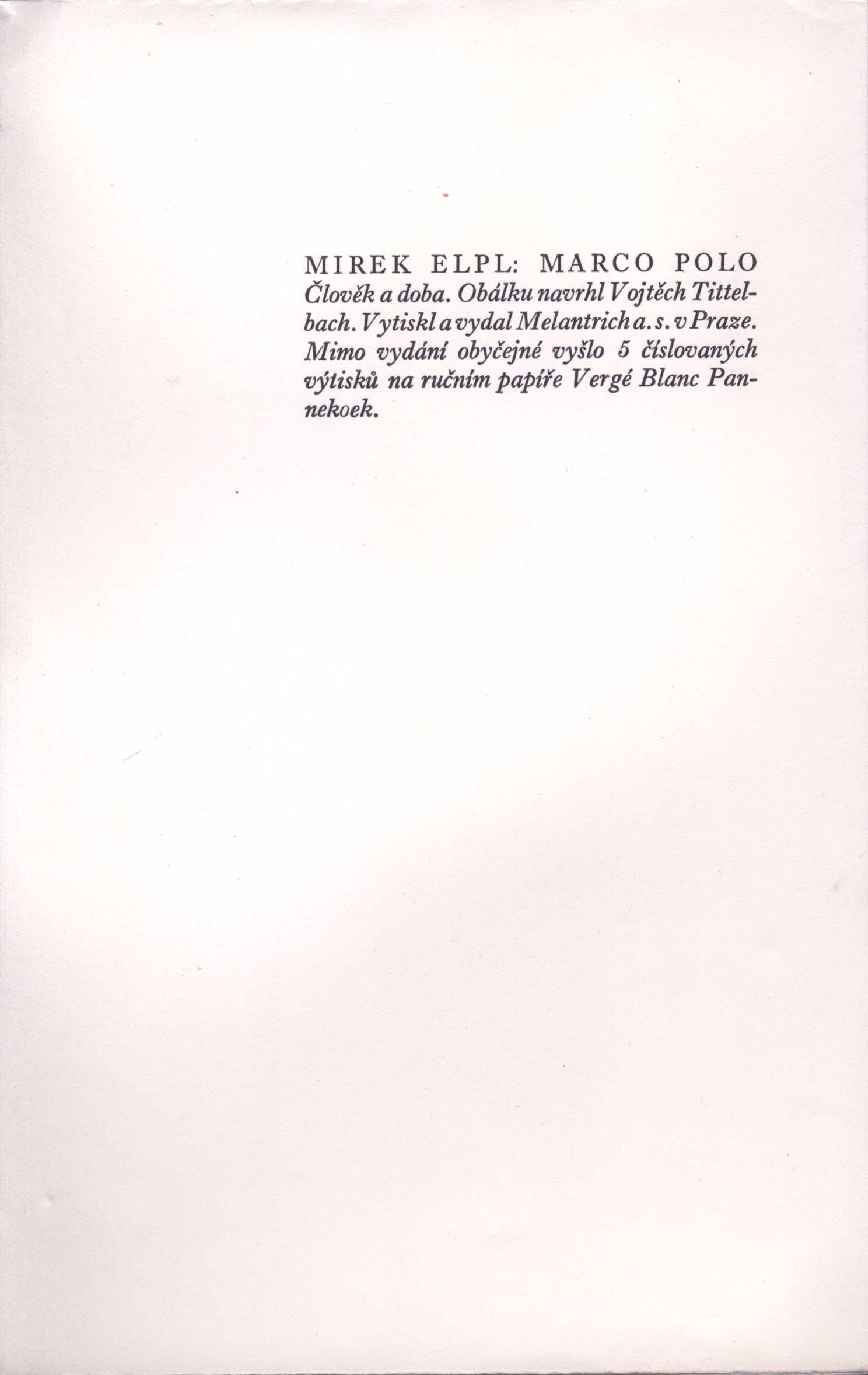 Title information Marco Polo : člověk a doba / Mirek Elpl ; [úvod Marco Polo v Čechách napsal Arne Novák ; obálku navrhl Vojtěch Tittelbach] Personal name Elpl, Mirek, 1905-1960 (Author) Další autoři Novák, Arne, 1880-1939 (Author of introduction) Tittelbach, Vojtěch, 1900-1971 (Bookjacket designer) Corporation Melantrich (nakladatelství) (Publisher) Publication V Praze : Melantrich, [1937] Scope 219 s. ; 8° Country Czech Republic Language Czech Note Vl. jm. autora: Elpl, Eduard