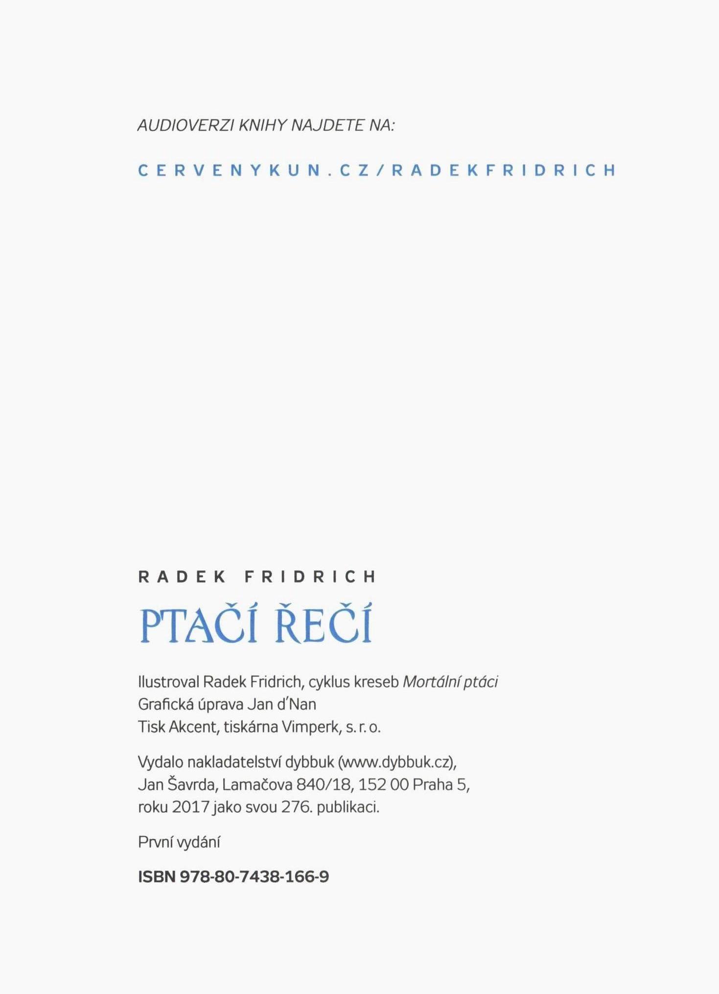 Title information Ptačí řečí / Radek Fridrich ; ilustroval Radek Fridrich, cyklus kreseb Mortální ptáci ; grafická úprava Jan d'Nan Personal name Fridrich, Radek, 1968- (Author) (Illustrator) Další autoři d'Nan, Jan (Book designer) Corporation Dybbuk (nakladatelství) (Publisher) Akcent tiskárna Vimperk (Printer) Edition statement První vydání Publication Praha : Dybbuk, 2017 Manufacture Vimperk : Akcent Scope 60 stran : barevné ilustrace ; 19 cm ISBN 978-80-7438-166-9 (brožováno) Country Czech Republic Language Czech Note Bleděmodrá obálka s černým textem. - Barevná přídeští, barevně ilustrovaná předsádka. - Nakladatelská značka na vakátě. - Barevný list s patitulem. - Rozložený, dvoubarevný titulní list s barevnou ilustrací a s dvoubarevným textem. - Citát. - Barevné celostránkové ilustrace. - Obsah. - Dvoubarevný text v tiráži. - Na zadní záložce stručná biografie autora. - Na zadní straně obálky nakladatelská značka.
