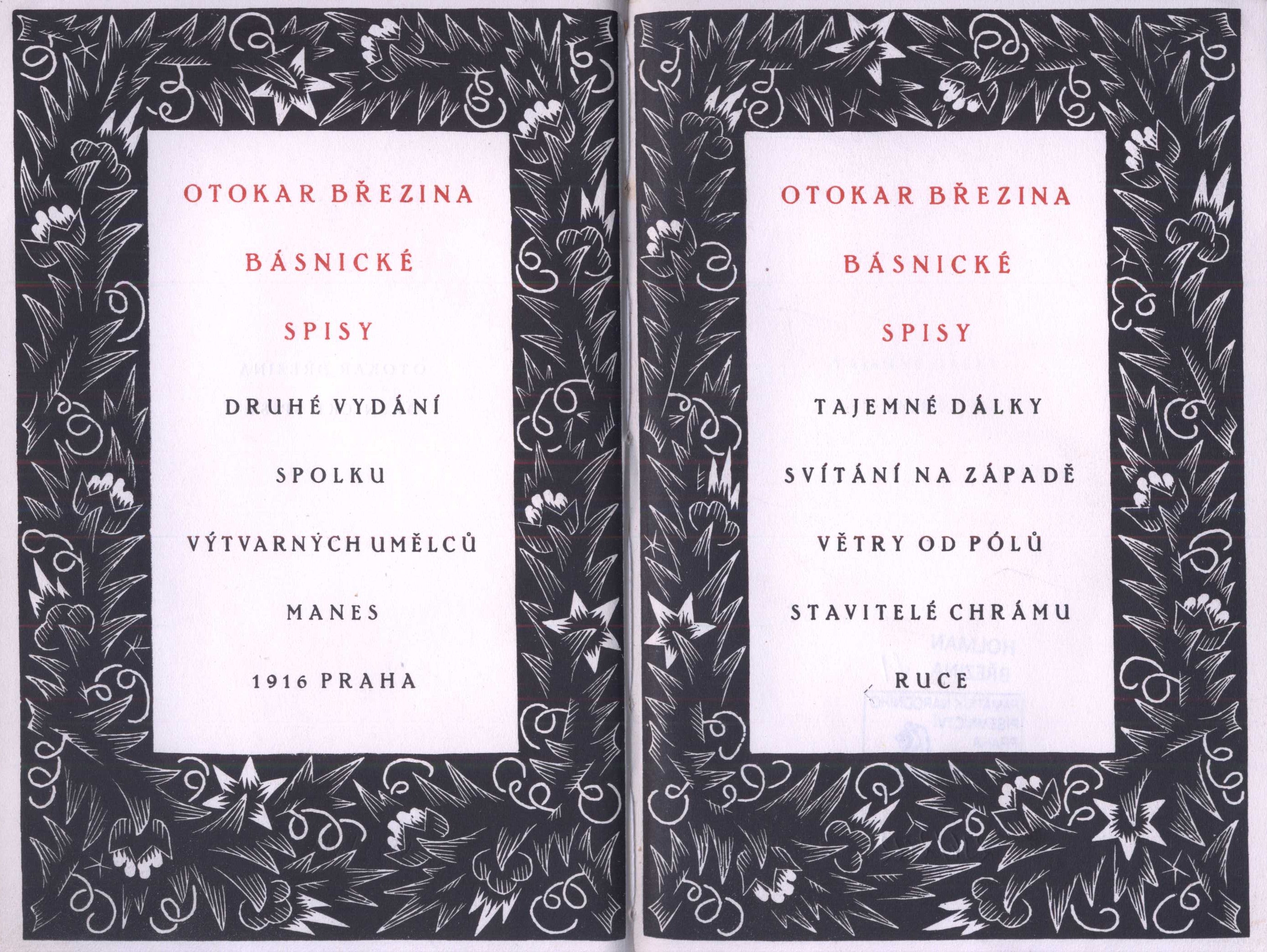 Title information Básnické spisy / Otokar Březina ; úpravu této knihy řídil a dřevoryty ryl Jaroslav Benda Personal name Březina, Otokar, 1868-1929 (Author) Další autoři Benda, Jaroslav, 1882-1970 (Book designer) (Illustrator) Corporation Spolek výtvarných umělců Mánes (Publisher) Grafia (tiskárna, nakladatelství) (Printer) Edition statement Druhé vydání Spolku výtvarných umělců Manes Publication Praha : Spolek výtvarných umělců Manes, 1916 Manufacture Grafia Scope 192 stran ; 19 cm ISBN (Brožováno) Country Czech Republic Language Czech Note Šedivá obálka z ručního papíru zdobená dřevorytovou vinětkou Jaroslava Bendy, který knihu upravil a rozloženou titulní stránku vyzdobil dřevorytovým ornamentálním rámcem. - Dvoubarevný tisk (červený a černý) rozložené titulní stránky.