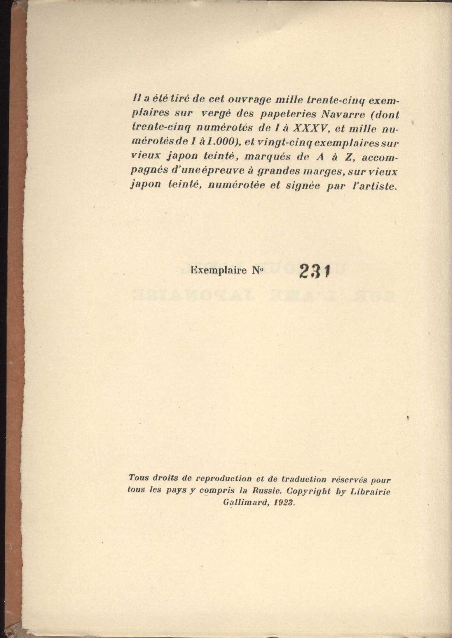 Title information Un coup d'oeil sur l'Ame Japonaise : discours aux etudiants de Nikko / Paul Claudel ; avec un portrait de l'auteur gravé sur cuivre par Foujita Personal name Claudel, Paul, 1868-1955 (Author) Další autoři Foujita, Léonard, 1886-1968 (Illustrator) Coulouma, Robert, činný 1918-1957 (Printer) Corporation Éditions de la Nouvelle Revue Française (Publisher) Vernant et Dollé (Paris, Francie) (Printer of plates) Publication Paris : Éditions de la Nouvelle Revue Française, 1923 Manufacture Coulouma) Scope 66 s. : il. + lístek s erraty ISBN brož. Country France Language French Note Přesný rozsah: 66, [6] s. - Bibliofilie. - Typografická obálka. - Jako frontispis originální suchá jehla - list zahrnutý do paginace. - Dvoubarevně (červeně a černě) tištěný titulní list. - Obsahuje poznámky. - Na obálce obsahuje nakladatelskou reklamu. - Vložen lístek s erraty. - Náklad 1305 výtisků.