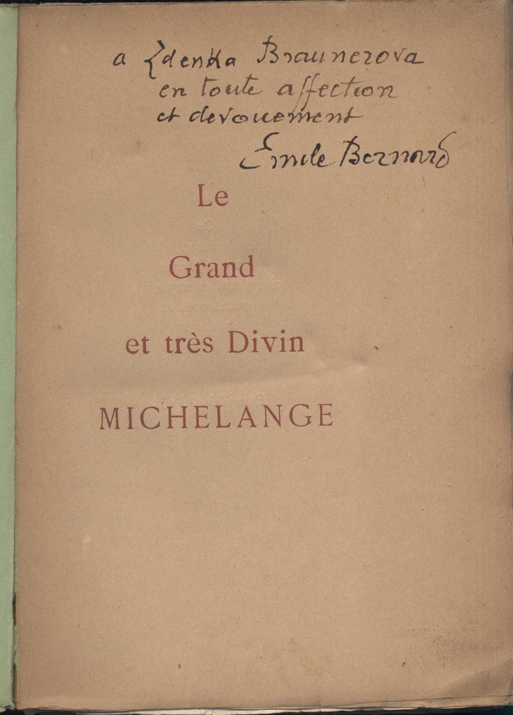 Title information Le grand et très divin Michelange : étude esthétique de l'homme et de l'oeuvre / Emile Bernard Personal name Bernard, Émile, 1868-1941 (Author) (Dedicator) Další autoři Braunerová, Zdenka, 1858-1934 (Dedicatee) (Former owner) Bernard, Michel-Ange (Publisher) (Printer) Publication Tonnerre : Michel-Ange Bernard, 1924 Scope 303 s., [4] l. obr. příl. : il. ISBN brož. Country France Language French Note Slepá obálka. - Červeně tištěný, prostě typograficky řešený přebal. - Na přebalu vročení 1925. - Seznam příloh. - Náklad sto padesát číslovaných výtisků. - Předmluva. - Čtyři listy obrazové přílohy na křídovém papíře s černobílými reprodukcemi Michelangelových podobizen. - Obsahuje rovněž několik Michelangelových sonetů ve francouzském překladu. - Vinětová výzdoba.