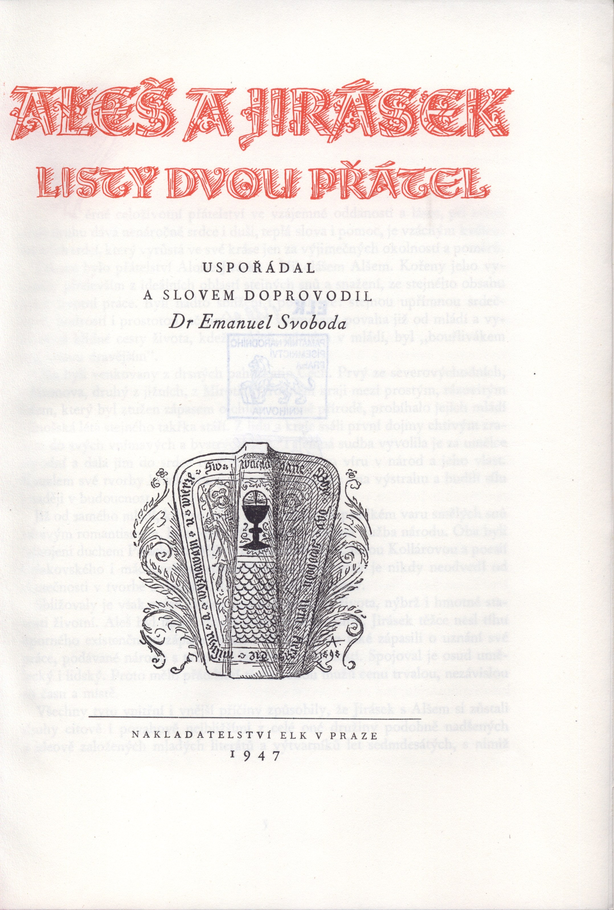 Title information Aleš a Jirásek : listy dvou přátel / uspořádal a slovem doprovodil Dr Emanuel Svoboda ; [s reprodukcemi kreseb Mikoláše Alše i Aloise Jiráska ; typografickou úpravu, obálku a vazbu navrhl Oldřich Menhart] Personal name Aleš, Mikoláš, 1852-1913 (Author) (Illustrator) Další autoři Jirásek, Alois, 1851-1930 (Author) (Illustrator) Svoboda, Emanuel, 1883-1967 (Compiler) (Author of introduction) Menhart, Oldřich, 1897-1962 (Typographer) (Bookjacket designer) (Binding designer) Corporation Evropský literární klub (nakladatelství) (Publisher) Průmyslová tiskárna v Praze (Printer) Štencův grafický závod (Printer of plates) Další var.názvy Listy dvou přátel Edition statement První vydání Publication V Praze : nakladatelství ELK, 1947 Manufacture (Průmyslová tiskárna) Scope 186, [1+22] l. obr. příl. : il. ; 28 cm ISBN volné listy Country Czech Republic Language Czech Note Volně vložené listy ve zdobené obálce. – Na přední záložce upoutávka na knihu. – U patitulu nakladatelská značka. – Frontispis. – Dvoubarevný titulní list s ilustrací. – Ilustrovaná iniciála. – Četné černobílé reprodukce v textu. – Vložené nestránkované obrazové přílohy. – Seznam vyobrazení v textu. – Přílohy s Alšovými obrazy. – Tiráž. – Na zadní záložce ediční upoutávka. – Na zadní straně obálky značka nakladatelského sdružení Kmen.