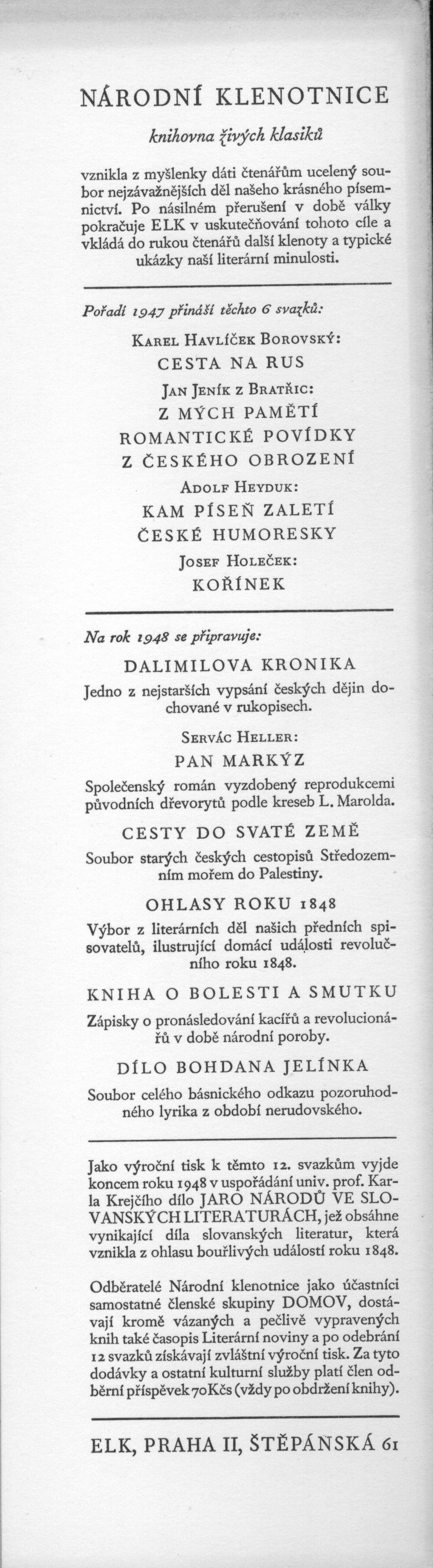 Document kind monografie Personal subjects Aleš, Mikoláš, 1852-1913 - malíř, kreslíř a ilustrátor * Jirásek, Alois, 1851-1930 - prozaik, dramatik Keywords čeští spisovatelé * čeští ilustrátoři * korespondence * vzájemná korespondence * Aleš M. * Jirásek A. * komentované vydání * reprodukce UDC 821.162.3-051 * 75(437)-051 * 82-6 * (044) * (044.2)-021.361 * (0.072) * (0.035) Uživatelské pole PNP U sign. ELK 0289a (výtisk ve volných složených listech) ilustrací (M. Aleš) zdobená obálka s barevným textem a nakladatelskou značkou (O. Menhart). – Na přední záložce upoutávka na knihu. – Slepá obálka. – U patitulu razítko Archiv Čs. spisovatel, č. N 867 a barevně nakladatelská značka (O. Menhart - neuvedeno). – Jako frontispis barevná (1.) reprodukce (M. Aleš) na hlazeném papíře. – Dvoubarevný titulní list s ilustrací. – Barevná ilustrovaná iniciála. – Četné černobílé reprodukce v textu. – Vložené nestránkované obrazové přílohy na hlazeném papíře. – Seznam vyobrazení v textu. – Přílohy s Alšovými obrazy. – Tiráž. – Na zadní záložce ediční upoutávka na Národní klenotnici. – Na zadní straně obálky značka nakladatelského sdružení Kmen (J. Kaplický – neuvedeno). U sign. ELK 0289a nerozřezané listy. Tiráž: "Aleš a Jirásek. Listy dvou přátel. Uspořádal a slovem doprovodil dr. Emanuel Svoboda. S reprodukcemi kreseb Mikoláše Alše i Aloise Jiráska. Typografickou úpravu, obálku a vazbu navrhl Oldřich Menhart. Přílohy i text vytiskla písmem Fournier Průmyslová tiskárna v Praze. Kresby a dvě barevné přílohy reprodukoval Štencův grafický závod. Pro své členy vydal v nákladu 5.000 výtisků ELK v Praze roku 1947. Za 150 Kčs brož. a 185 Kčs váz. První vydání." Rozsah: 186, [6] s., [1+22] l. obr. příl. Rozměr: 27,7 cm Call number Track No. Location Info ELK 0289a 1549/2013 Sbírka