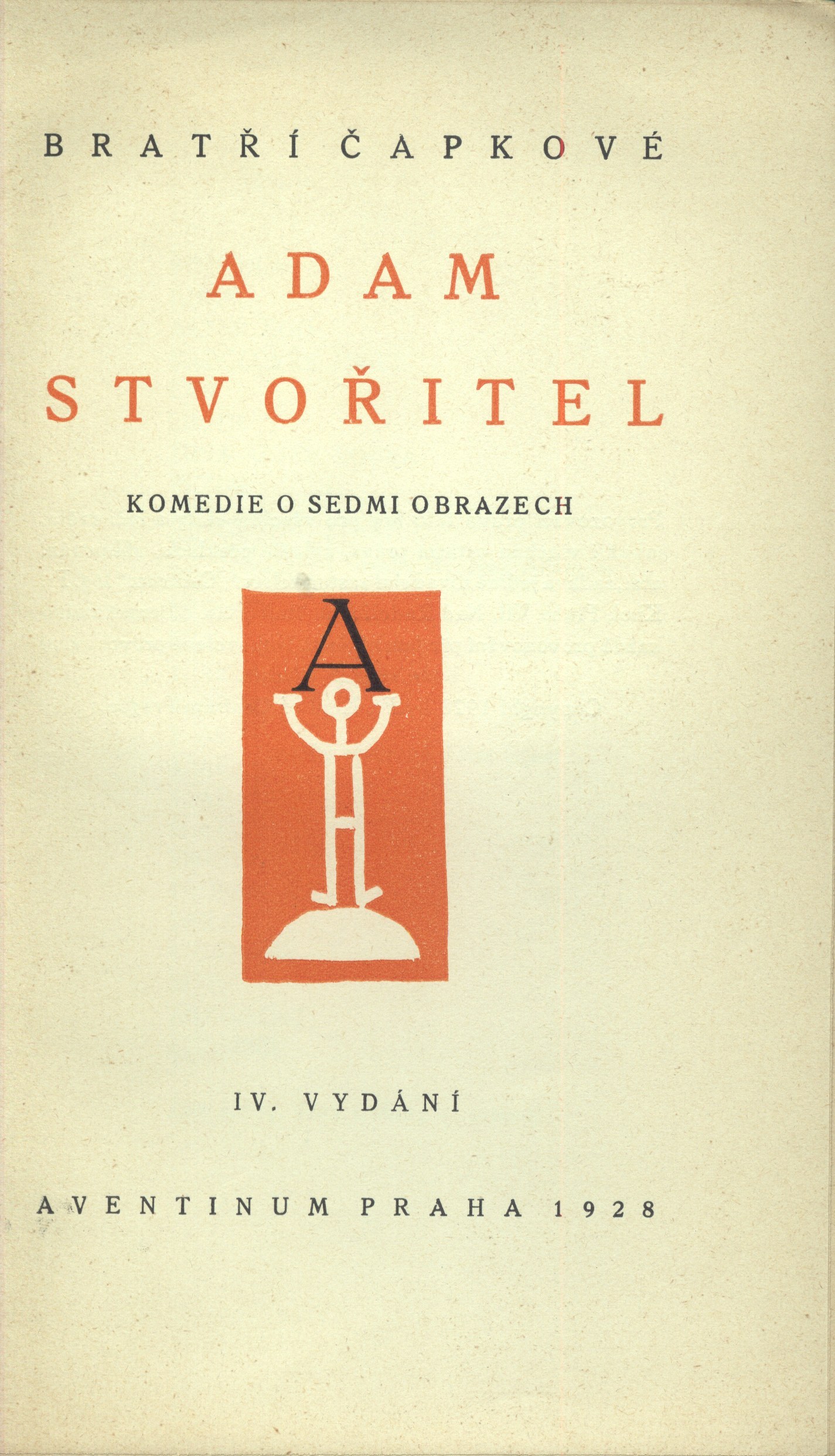 Title information Adam stvořitel : komedie o sedmi obrazech / bratří Čapkové ; [v úpravě Josefa Čapka] Personal name Čapek, Josef, 1887-1945 (Author) (Book designer) Další autoři Čapek, Karel, 1890-1938 (Author) Corporation Dr. Ot. Štorch-Marien (nakladatelství) (Publisher) Aventinum (nakladatelství) (Publisher) František Obzina (tiskárna, nakladatelství) (Printer) Další var.názvy Komedie o sedmi obrazech Edition statement IV. vydání Publication Praha : Aventinum, Dr. Ot. Štorch-Marien, 1928 Manufacture F. Obzina) Scope 92 s. : il. ; 22 cm Edition Aventinum 160. svazek
