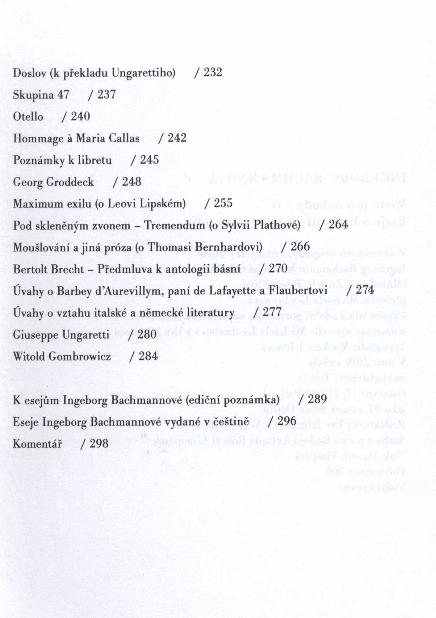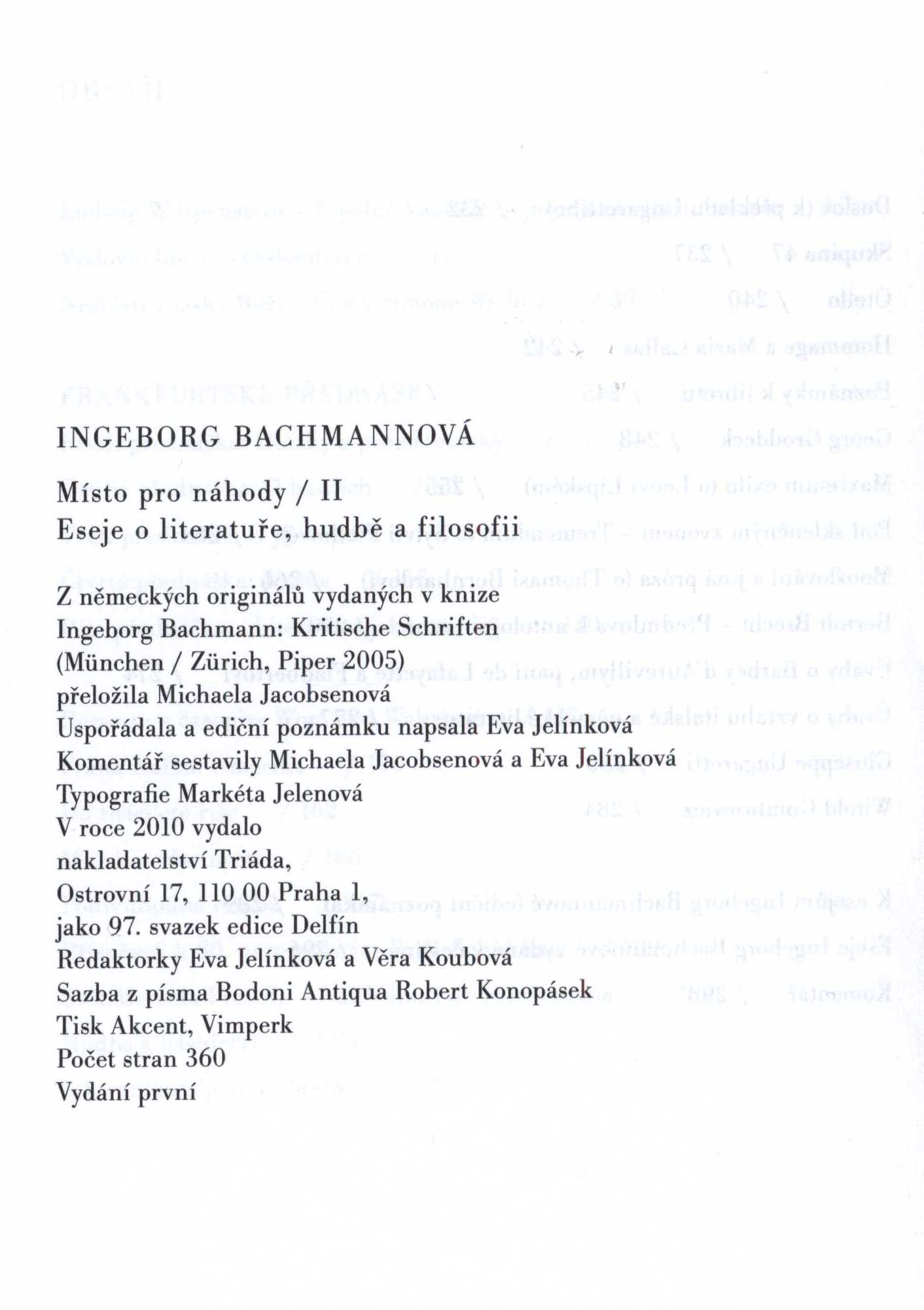 Delfín, (Triáda)Country Czech Republic Language Czech Language of the original German Note Obálka. - Frontispis. - Titulní list. - Poznámky pod čarou. - Ediční poznámka. - Eseje I. B. vydané v češtině. - Komentář. - Obsah. - Tiráž s edicí