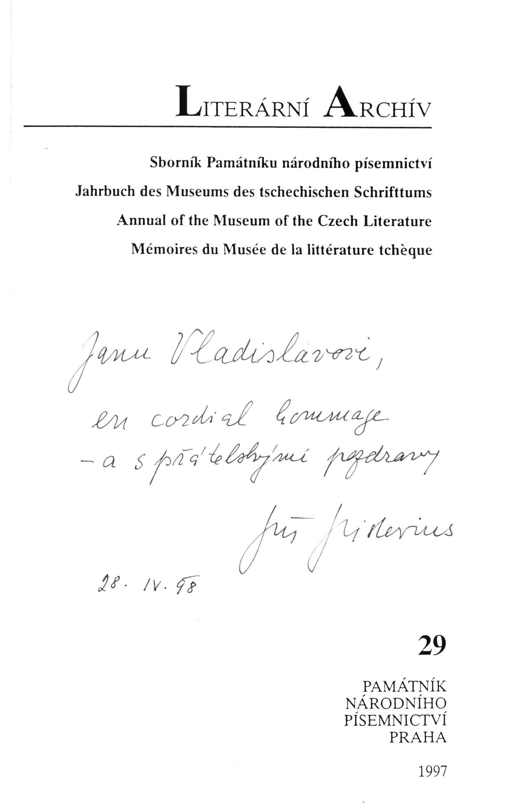 Uživatelské pole PNPSign. JVlaidslav 1412 - dedikace ''Janu Vladislavovi, en cordial hommage - a s přítelskými pozdravy Jiří Pistorius 28. IV. '98'', jedná se o kopii.