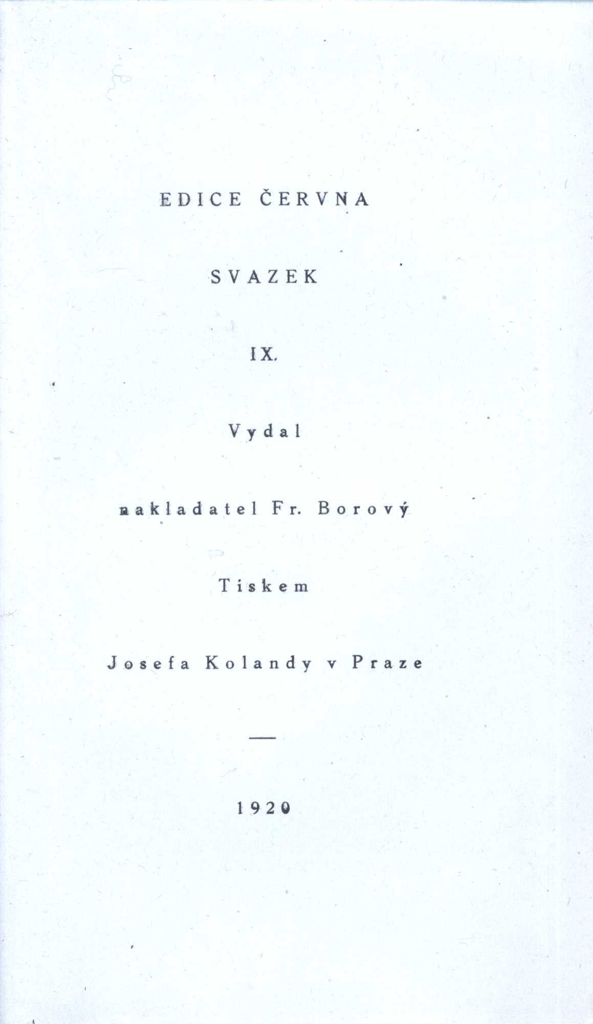 V kartě archivu Fr. Borového uvedeno ještě, že autorem obálky a grafické úpravy je V. H. Brunner, vydání 1., a ceny.