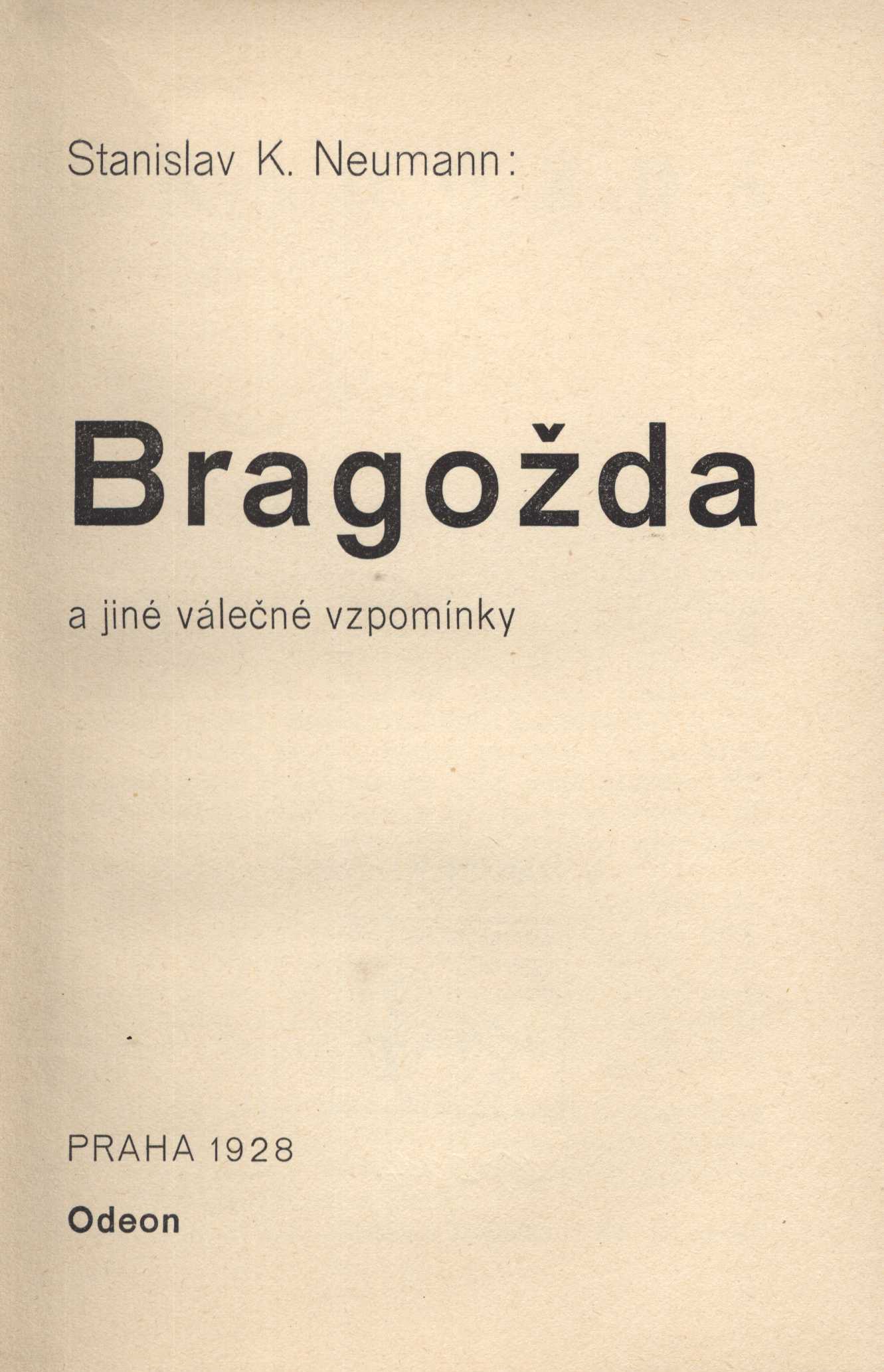 Bragožda a jiné válečné vzpomínky / Stanislav K. Neumann ; [úprava a obálka Karla Teigeho]. -- Praha : Odeon, 1928 Chotkova 11 :. -- (Orbis). -- 85 s. -- (Edice Odeon ; sv. 47.). -- Typograficky řešená obálka a úprava Karla Teigeho. - Na zadní straně informace o dílech Stanislava Kostky Neumanna. - 47. svazek edice Odeon. - Sazba písmem Antiqua. - "Vyšlo též 25 číslovaných a autorem podepsaných výtisků na similijapanu.". -- ISBN : brož./váz.