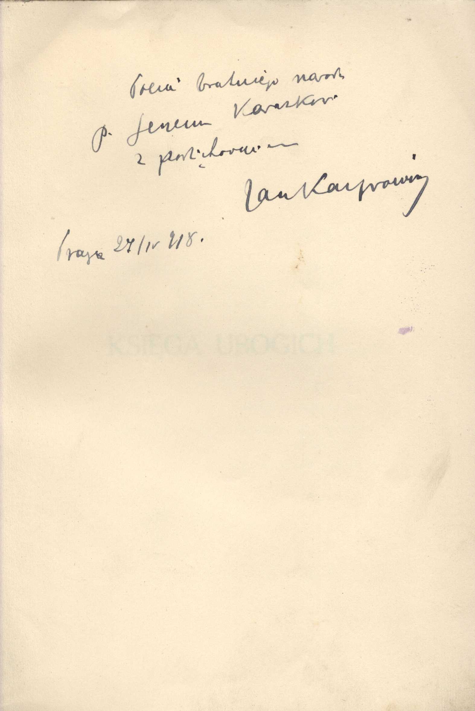 Signatura KaG XI B 62: Rukopisná dedikace Jana Kasprowicze Jiřímu Karáskovi ze Lvovic: "Poecii bratnego naroda p. Jerzemu Karaskovi [?] Jan Kasprowicz Praga 27/IV 918."