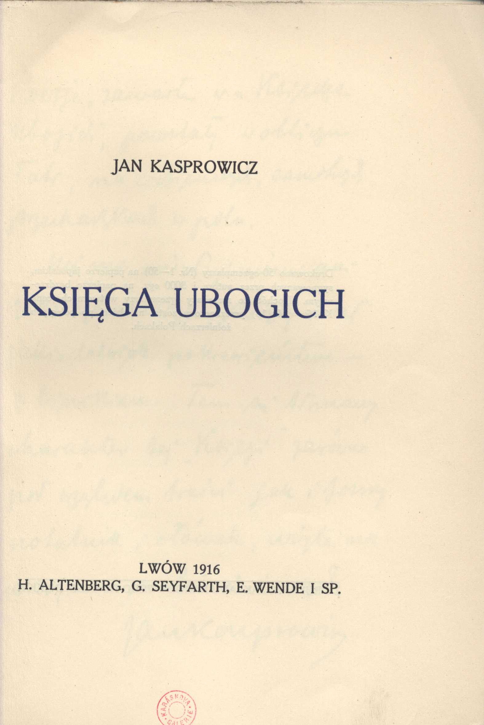 Księga ubogich / Jan Kasprowicz. -- Lwów : H. Altenberg, G. Seyfarth, E. Wende i sp., 1916. -- (Z Drukarni Zakładu narodowego Im. Ossolińskich). -- 165, ii s. -- Přesný rozsah: [4], 165, ii s. - Typografická obálka. - Informace o dalších dílech autora. - Modrý a černý tisk titulního listu. - Faksimile. - "Drukowano 50 egzemplarzy (Nr. 1-50) na papierze japońskim, sygnowanych przez autora i 3000 egz. na papierze bezdrzewnym. Dochód ze sprzedaży egzemplarzy wytwornych (cena K. 15 = Mk 15) przeznaczony został na dzieci po poległych żołnierzach Pokalach.". -- Summary: (dedkg). -- ISBN : brož.