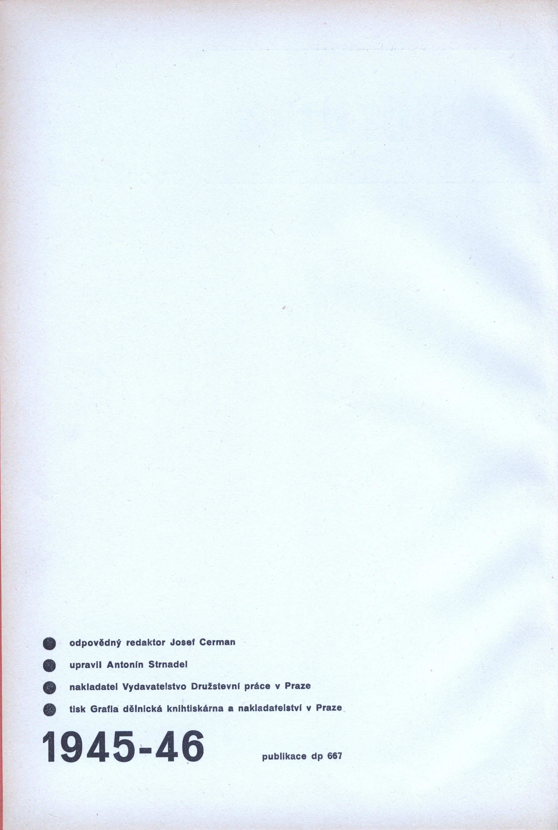 Title information Panorama Další autoři Cerman, Josef, -1949 (Editor) Strnadel, Antonín, 1910-1975 (Book designer) Corporation Družstevní práce (nakladatelství) (Publisher) "Grafia", dělnická knihtiskárna (tiskárna, nakladatelství) (prt (Praha)) Roč., číslo ročník 21, číslo 1-15, 1945-1946 Publication V Praze : Vydavatelstvo Družstevní práce, 1945-1946 Scope 168 stran : ilustrace Country Czech Republic Language Czech Note Zdobená obálka ve dvou grafických provedeních a v různých barevných provedeních. - Ilustrováno černobílými ilustracemi a fotografiemi. - Částečně tištěno na křídovém papíře (fotografie a reklamy).