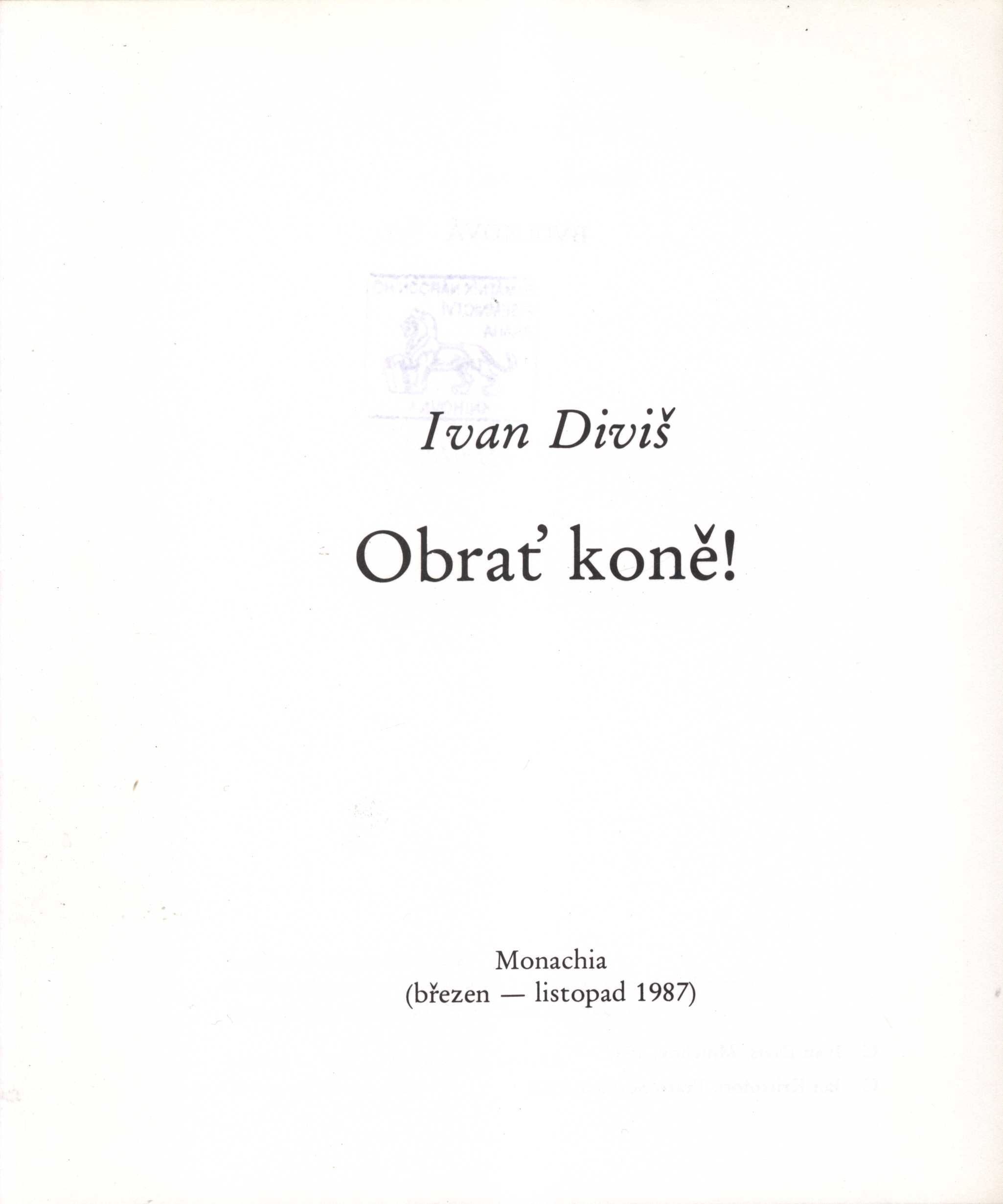 Obrať koně! / Ivan Diviš ; k tisku připravil a kolážemi z Albrechta Dürera obohatil Jan Kristofori. -- Mnichov : Monachia, [1987?]. -- 105 stran : ilustrace ; 21 cm. -- Ilustrovaná obálka. - Černobílé ilustrace. -- Náklad 333 číslovaných výtisků. - Soukromý neprodejný tisk. -- ISBN : brožováno.