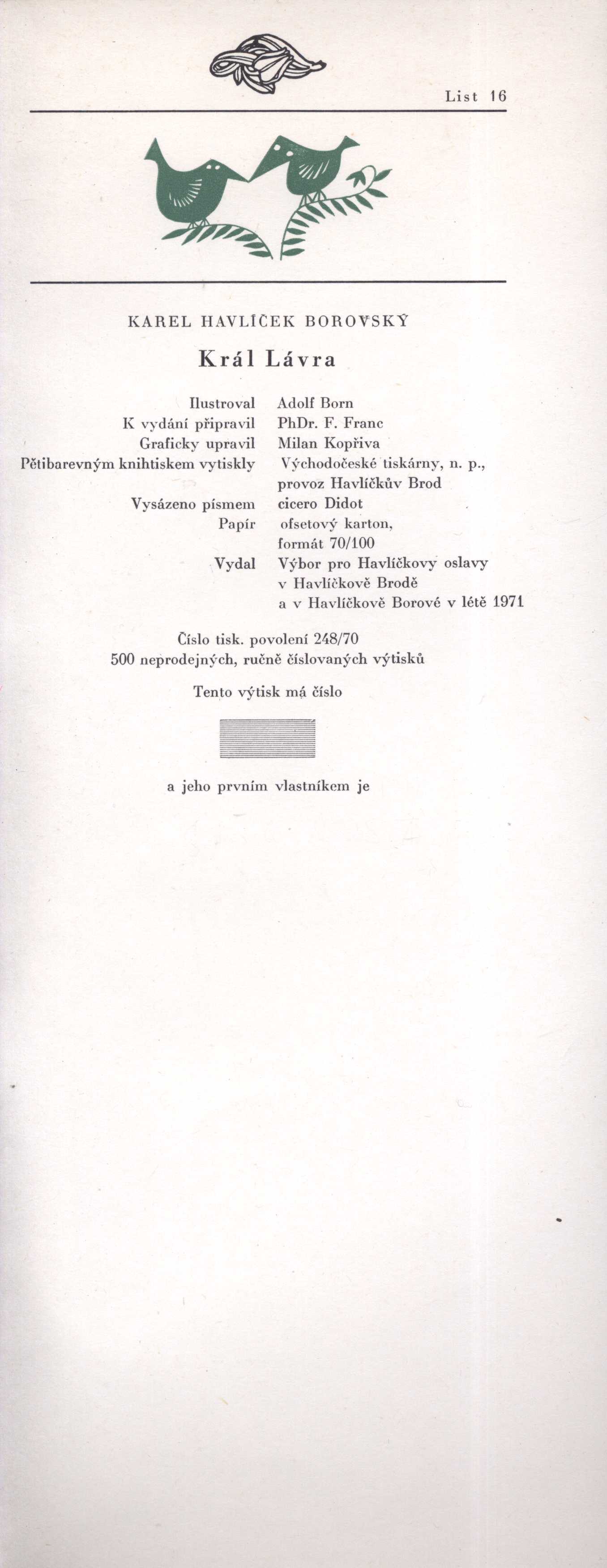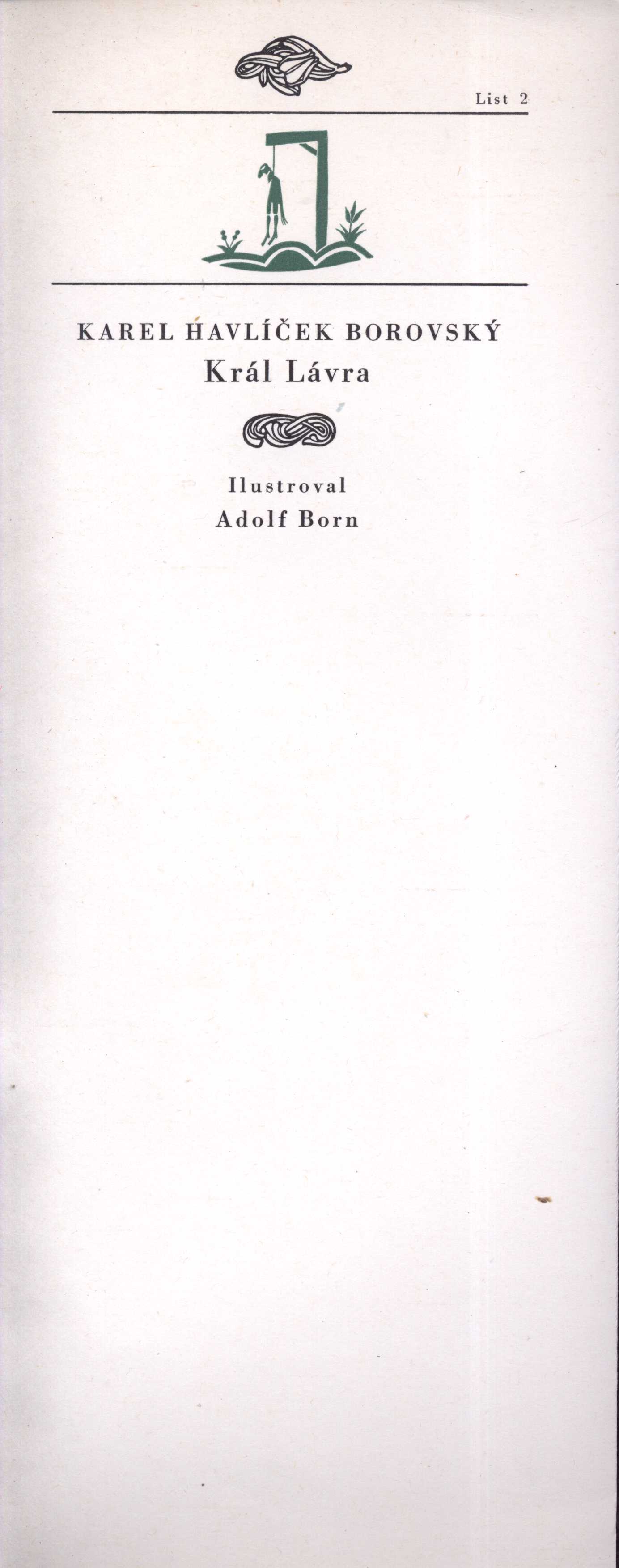Title information Král Lávra / Karel Havlíček Borovský ; ilustroval Adolf Born ; [k vydání připravil F. Franc ; graficky upravil Milan Kopřiva] Personal name Havlíček Borovský, Karel, 1821-1856 (Author) Další autoři Born, Adolf, 1930-2016 (Illustrator) Kopřiva, Milan, 1929-1997 (Book designer) Publication Havlíčkův Brod : Výbor pro Havlíčkovy oslavy, 1971 Manufacture Východočeské tiskárny) Scope 16 listů : il. Country Czech Republic Language Czech Note Zdobená obálka a titulní list. - Barevné ilustrace. - Volné listy v papírové obálce
