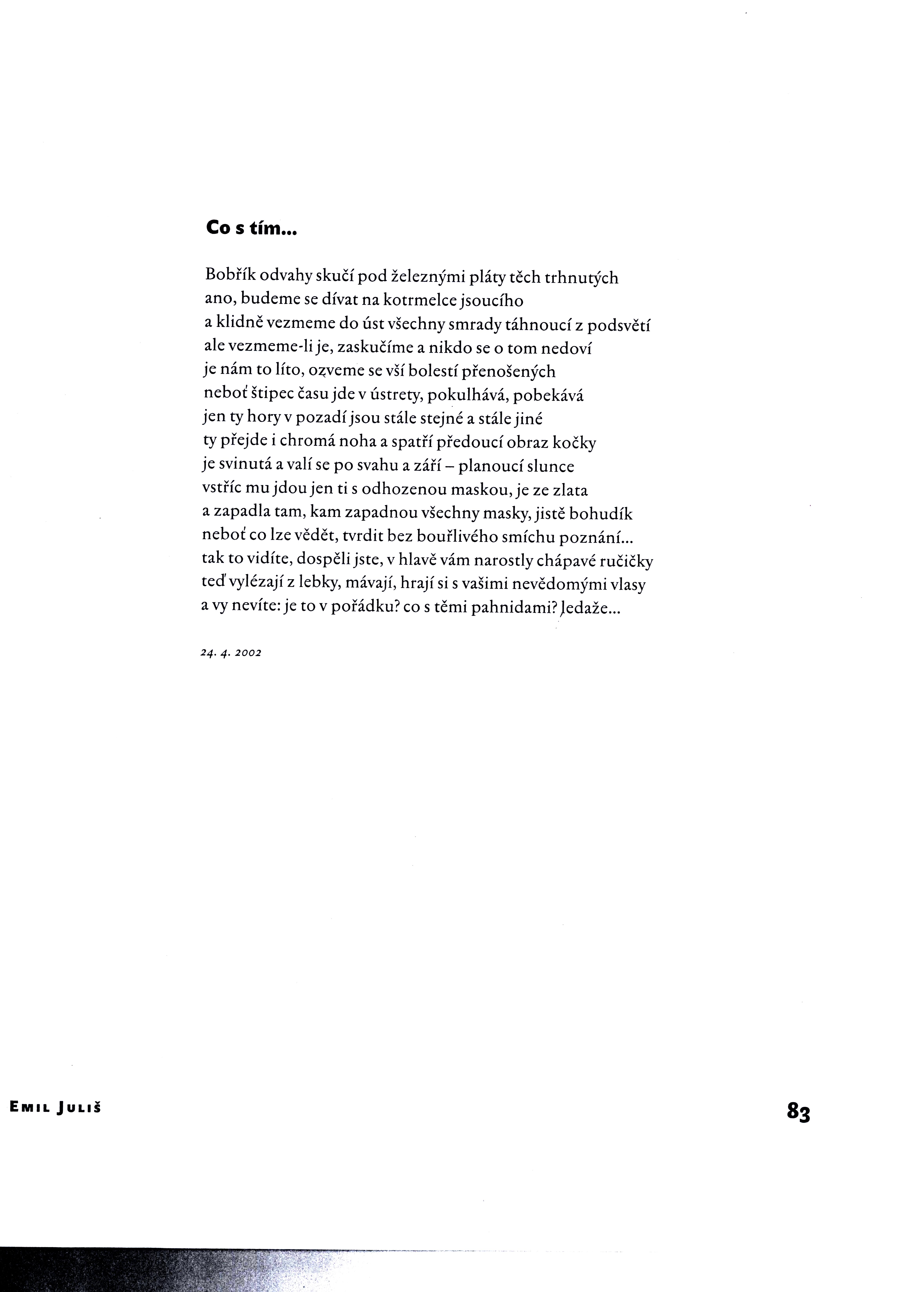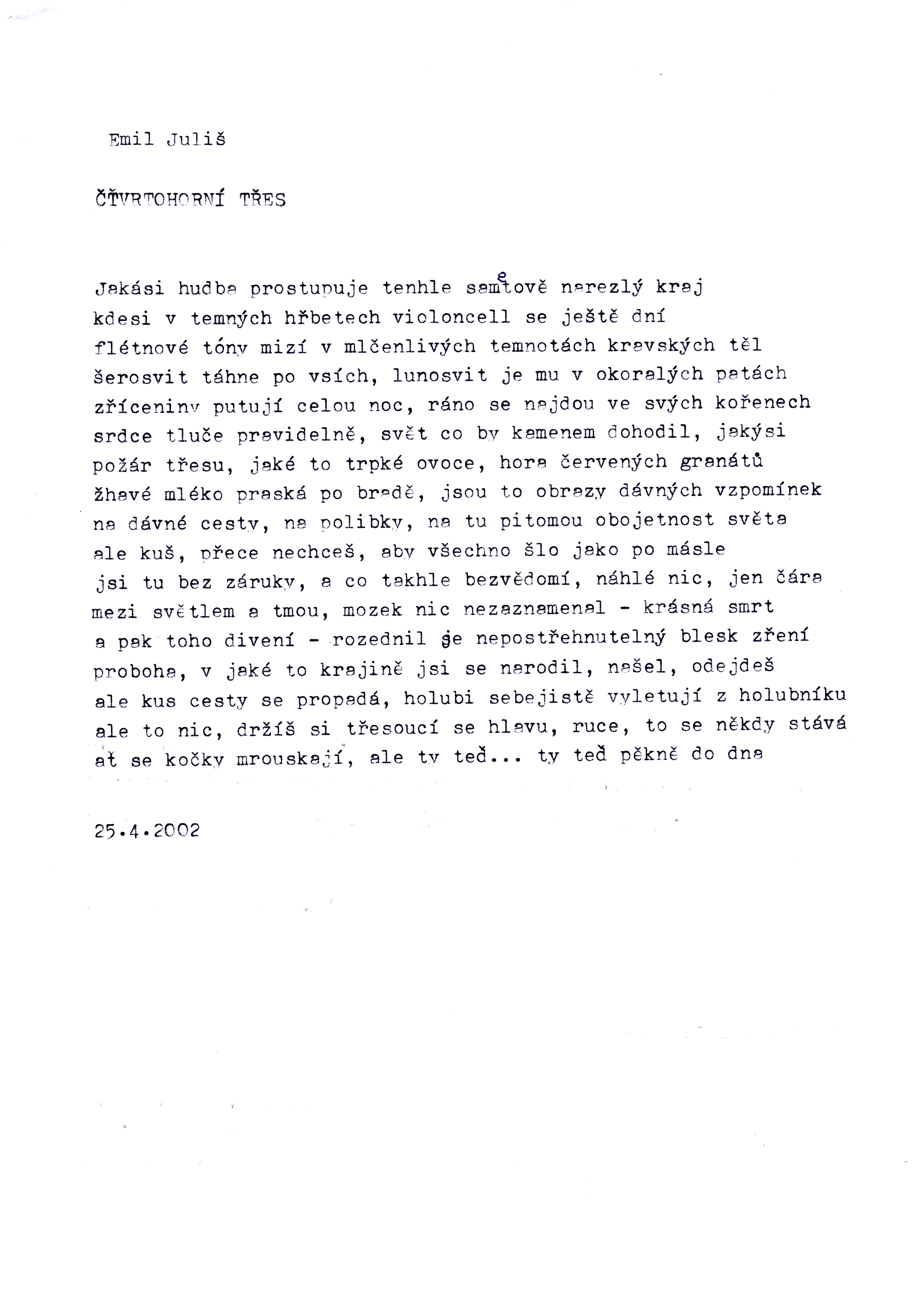 Sign. EJuliš0442: přiloženy 3 listy (xerokopie) s básněmi E. Juliše: Co s tím ..., Čtvrtohorní třes a Sklerotikon. - Knihovna E. Juliš.