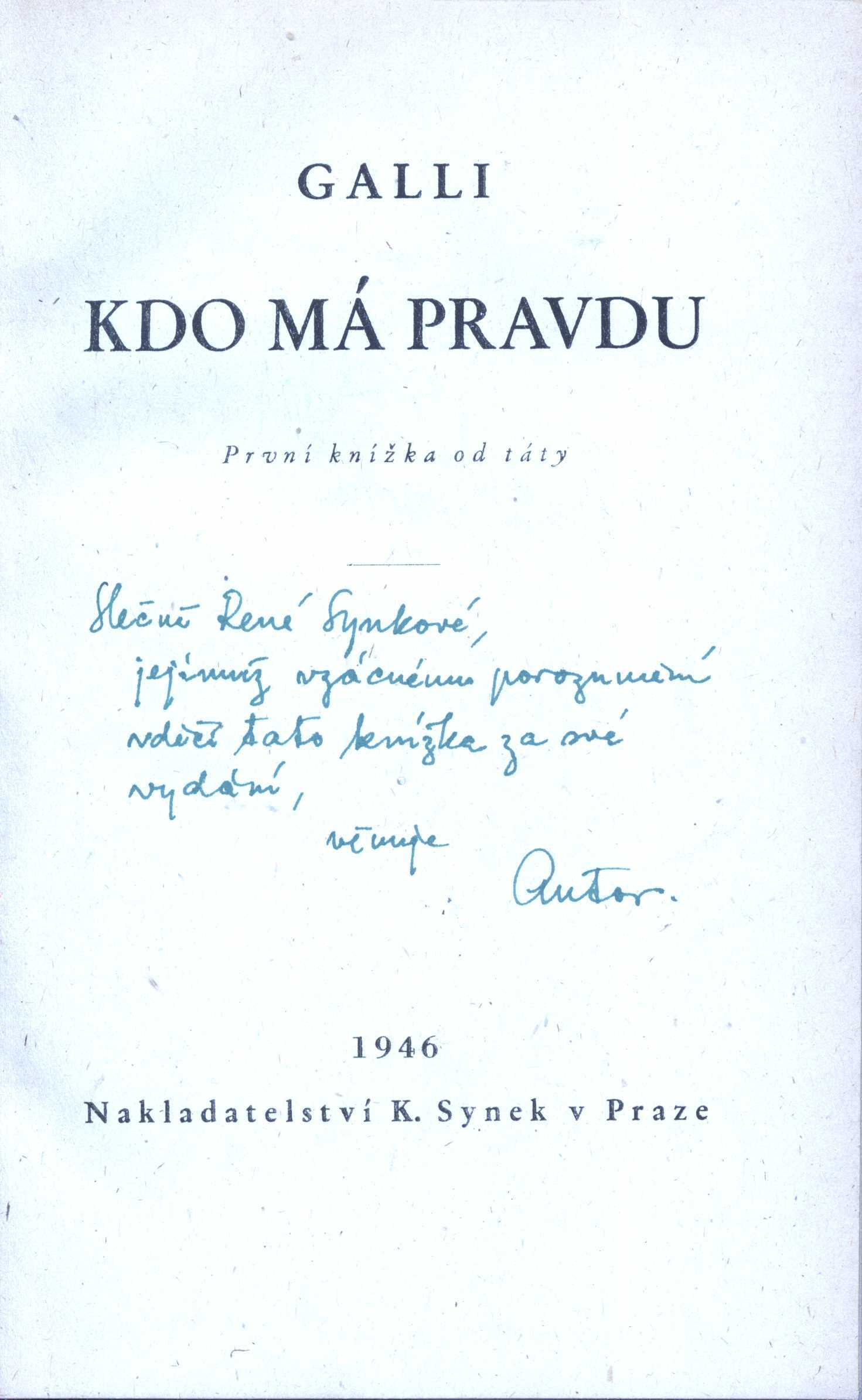 Title information Kdo má pravdu : první knížka od táty / Galli ; [obálka a kresby Vladimír Kovářík] Author Galli (Author) Další autoři Kovářík, Vladimír, 1921-1999 (Bookjacket designer) (Illustrator) Corporation Karel Synek (nakladatelství) (Publisher) tiskárna C. Weigend (Duchcov) (Printer) Edition statement Vyd. 1. Publication V Praze : K. Synek, 1946 Manufacture C. Weigend, nár. správa) Scope 173 s. : il. ISBN (váz.) Edition Kolotoč sv. 2