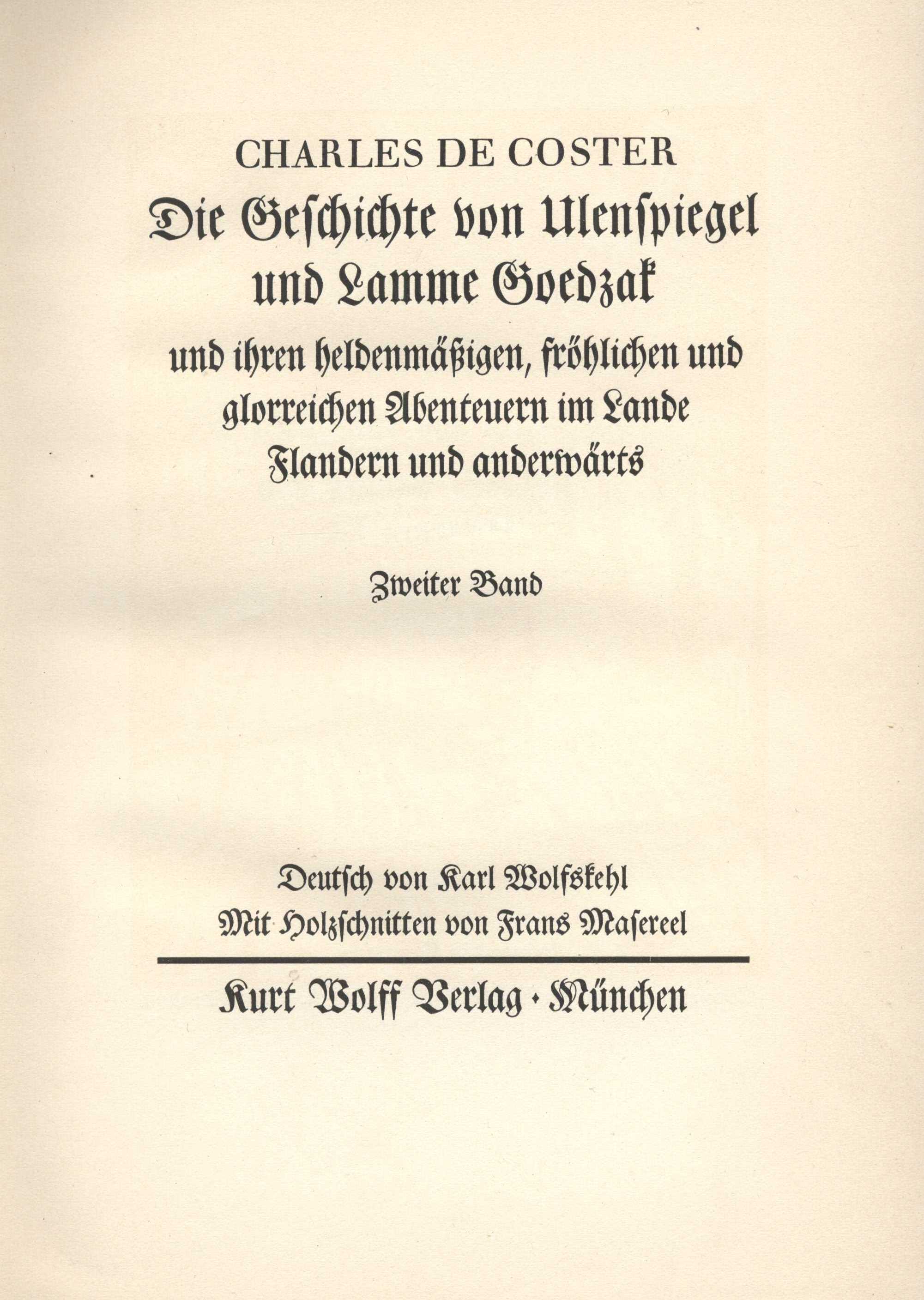 1. Title informationDie Geschichte von Ulenspiegel und Lamme Goedzak und ihren heldenmässigen, fröhlichen und glorreichen Abenteuern im Lande Flandern und anderwärts / Charles de Coster ; deutsch von Karl Wolfskehl ; mit holzschnitten von Frans Masereel. Zweiter Band