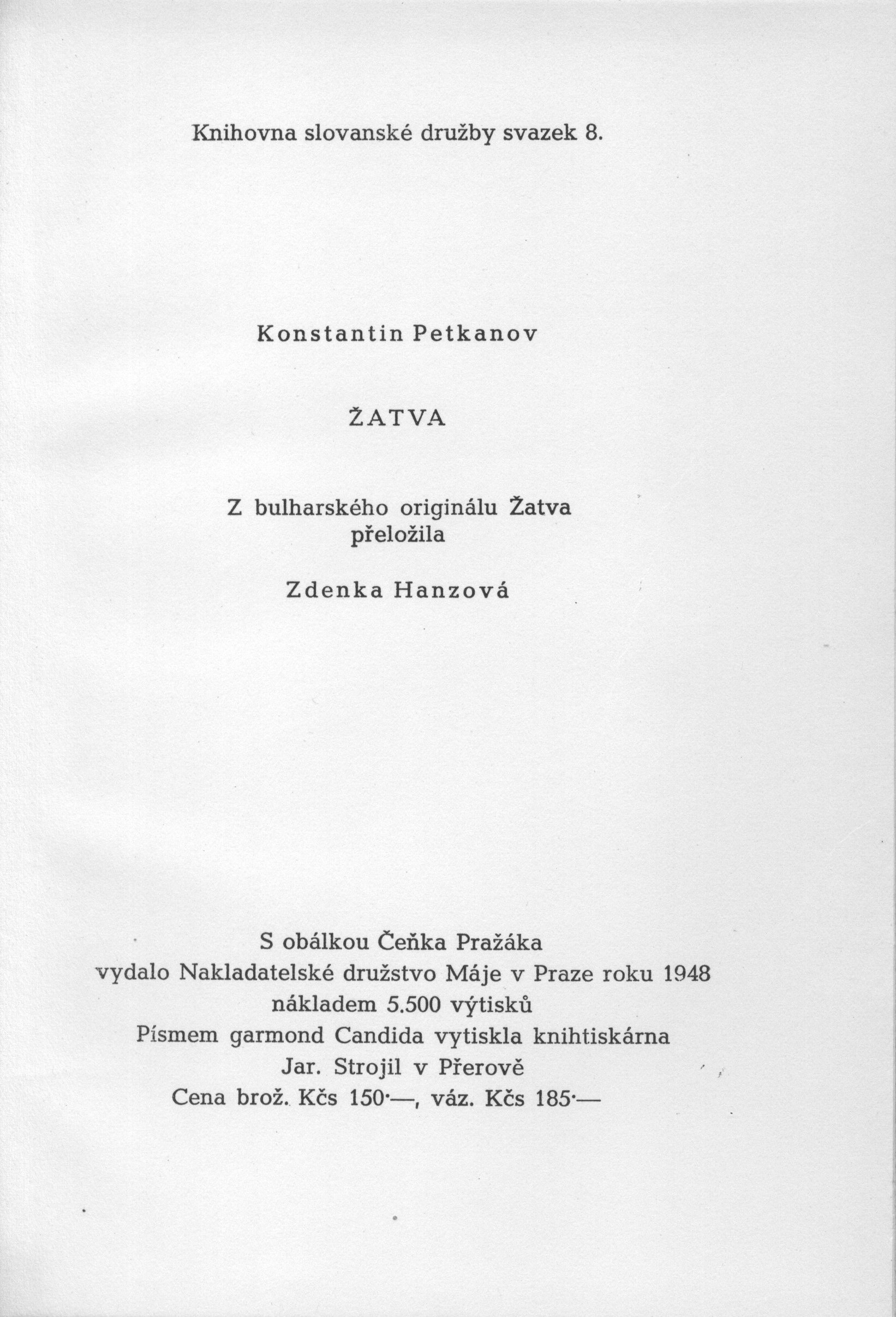 Tiráž: "Knihovna slovanské družby svazek 8. Konstantin Petkanov. Žatva. Z bulharského originálu Žatva přeložila Zdenka Hanzová. S obálkou Čeňka Pražáka vydalo Nakladatelské družstvo Máje v Praze roku 1948 nákladem 5.500 výtisků. Písmem garmond Candida vytiskla knihtiskárna Jar. Strojil v Přerově. Cena brož. Kčs 150,-, váz. Kčs 185.-"