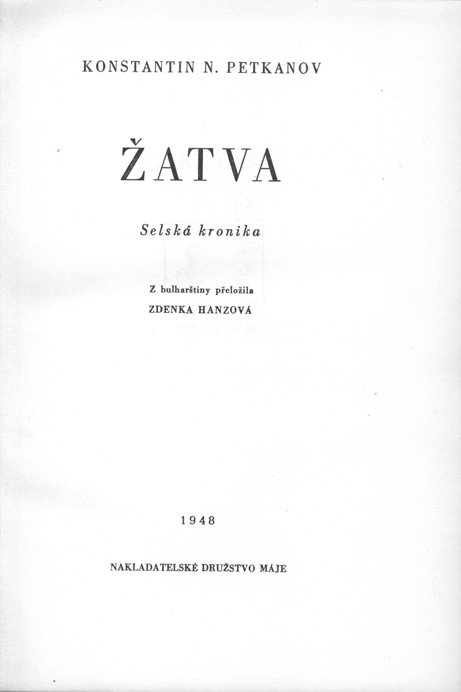 1. Title informationŽatva : selská kronika / Konstantin N. Petkanov ; z bulharštiny přeložila Zdenka Hanzová ; [s obálkou Čeňka Pražáka]