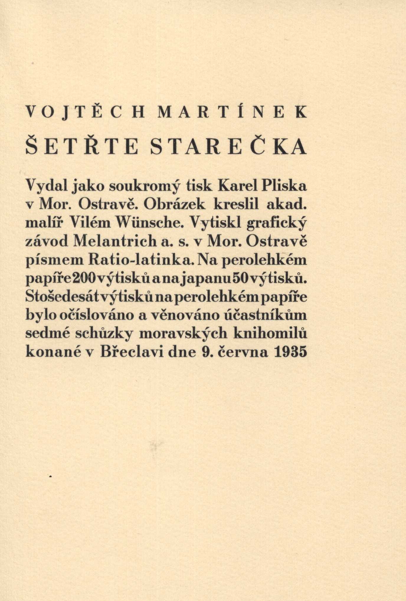 Title information Šetřte starečka / [Vojtěch Martínek ; obrázek kreslil akad. malíř Vilém Wünsche] Personal name Martínek, Vojtěch, 1887-1960 (Author) Další autoři Wünsche, Vilém, 1900-1984 (Illustrator) Pliska, Karel (Publisher) Corporation Melantrich a.s. (grafický závod v Moravské Ostravě) (Printer) Publication V Mor. Ostravě : Karel Pliska, 1935 Manufacture (Vytiskl grafický závod Melantrich a.s.) Scope [11] s. : il. ISBN bez vazby Country Czech Republic Language Czech Note Složené nerozřezané listy v obálce. - Černobílá ilustrace s podpisem autora. - Vydáno 200 výtisků na perolehkém papíře a 50 výt. na japanu. 160 výt. na perolehkém papíře bylo číslováno a věnováno účastníkům sedmé schůzky moravských knihomilů konané v Břeclavi 9. června 1935.