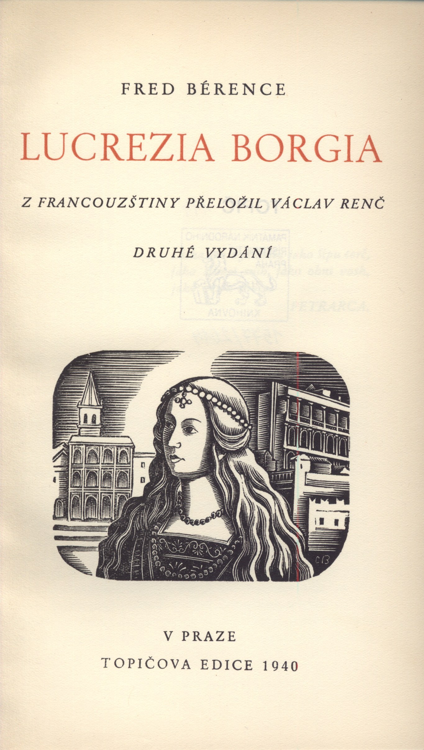 Title information Lucrezia Borgia / Fred Bérence ; z francouzštiny přeložil Václav Renč ; [dřevoryt a grafická úprava Cyrila Boudy] Personal name Bérence, Fred, 1889-1977 (Author) Další autoři Renč, Václav, 1911-1973 (Translator) Bouda, Cyril, 1901-1984 (Illustrator) (Book designer) Corporation Topičova edice (nakladatelství) (Publisher) Osvěta (tiskárna) (Printer) Edition statement Druhé vydání Publication V Praze : Topičova edice, 1940 Manufacture Osvěta, společnost s o. r.) Scope 358 s. : il. ; 22 cm ISBN (váz.) Edition Topičovy Bílé knihy : zrcadlo literárního světa / řídí Josef Knap