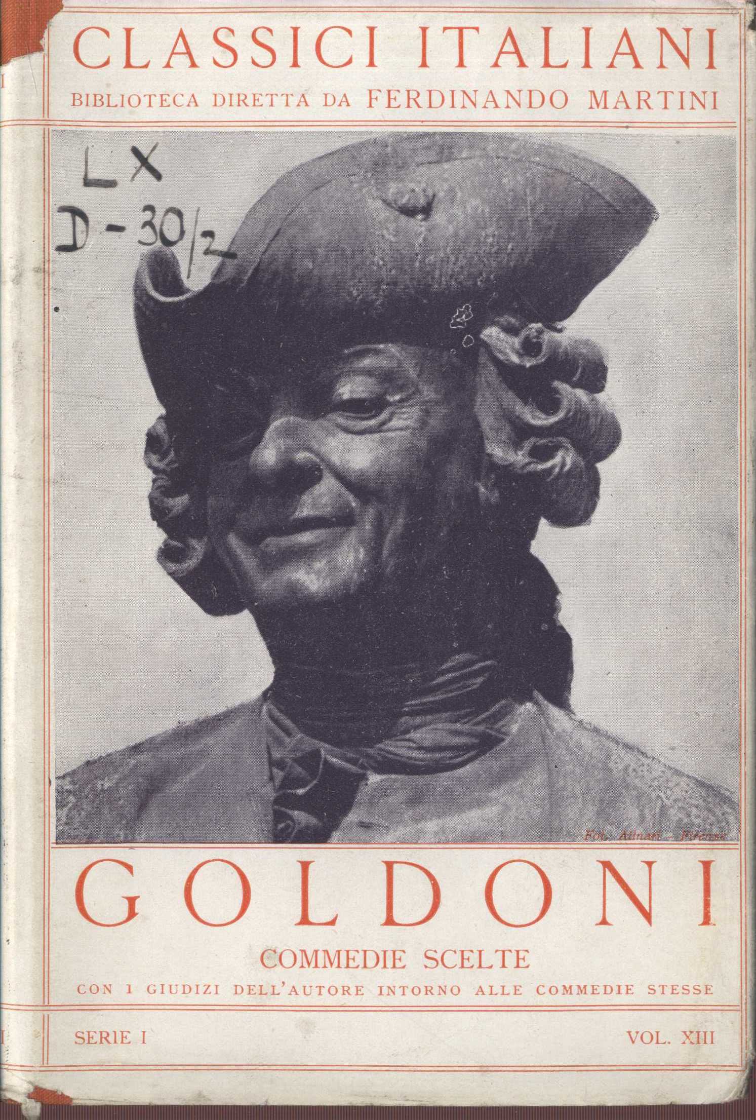 Classici italiani, (Instituto editoriale italiano)Country Italy Language Italian Note Zdobený barevný přebal. - Zdobená celoplátěná vazba. - Červený a černý tisk knihy. - Ilustrovaný titulní dvojlist. - Jeden list obrazové přílohy s fotografií Goldoniho sochy, reprodukovanou i na přebalu.