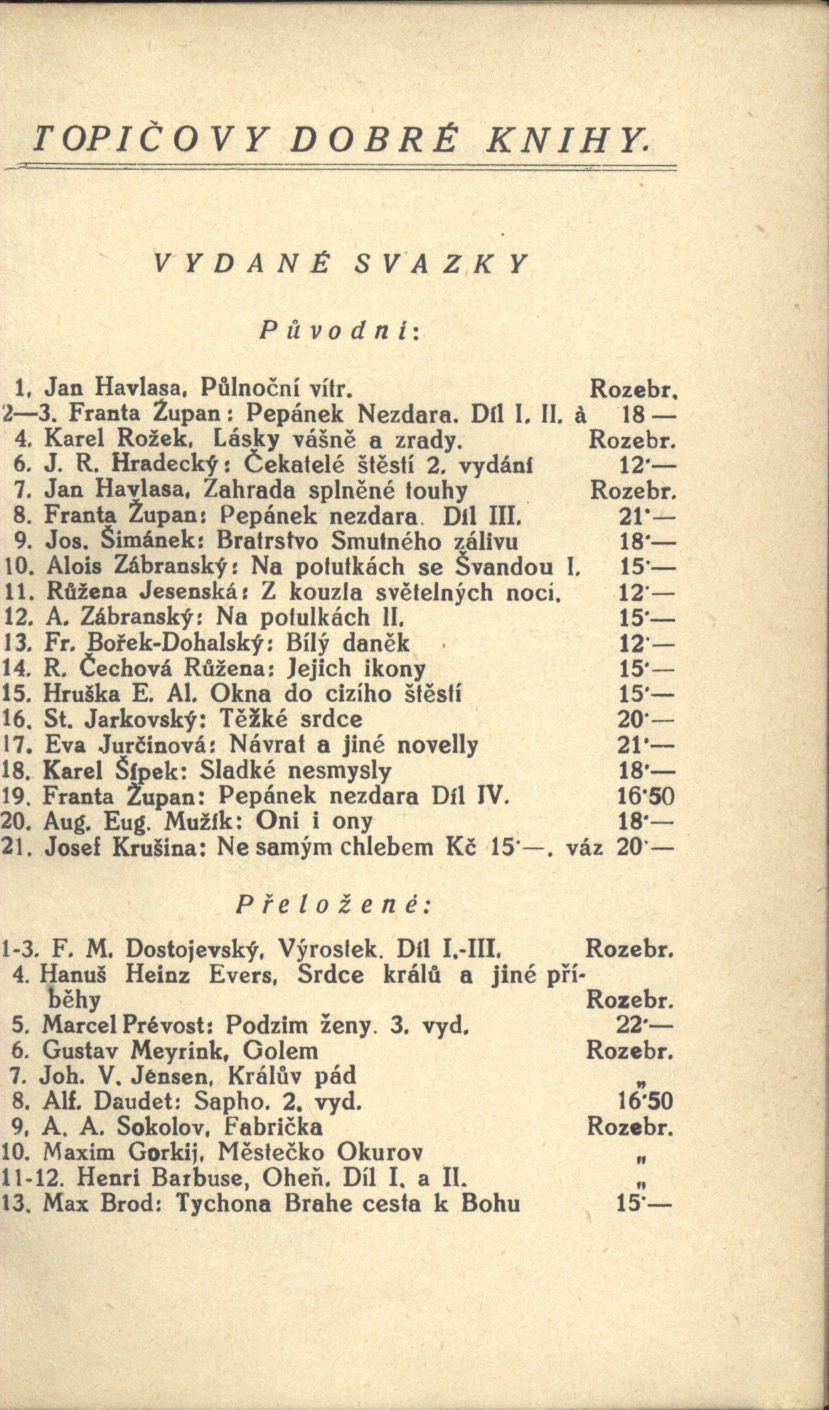 Topičovy dobré knihy přeložené, (F. Topič)Country Czech Republic Language Czech Language of the original Russian Note Zdobená vazba. - Soupis edice. - Edice nad názvem, s nakladatelskou značkou. - Tiskárna. - Obsah. - Bez tiráže.
